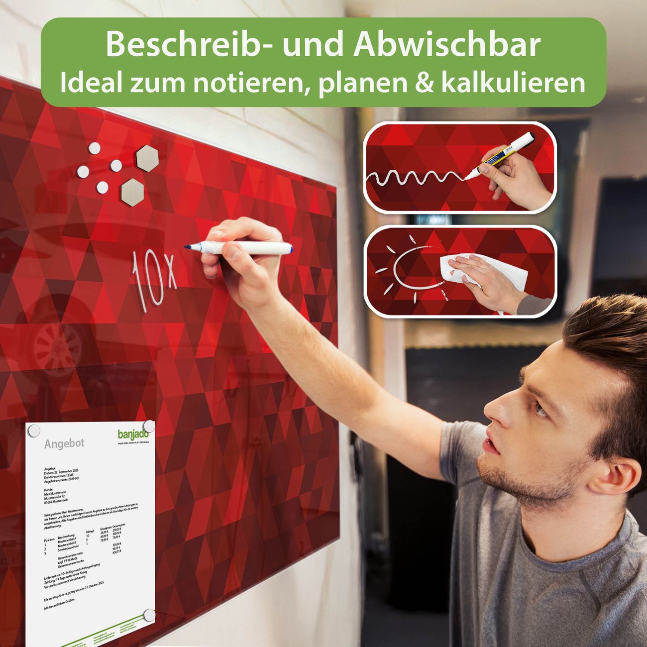 Jede Glas Magnettafel wird in unserer Werkstatt von Hand gefertigt und sorgfältig geprüft. So erhalten Sie ein echtes Qualitätsprodukt, das Funktion und Ästhetik perfekt vereint.?? Warum banjado?
