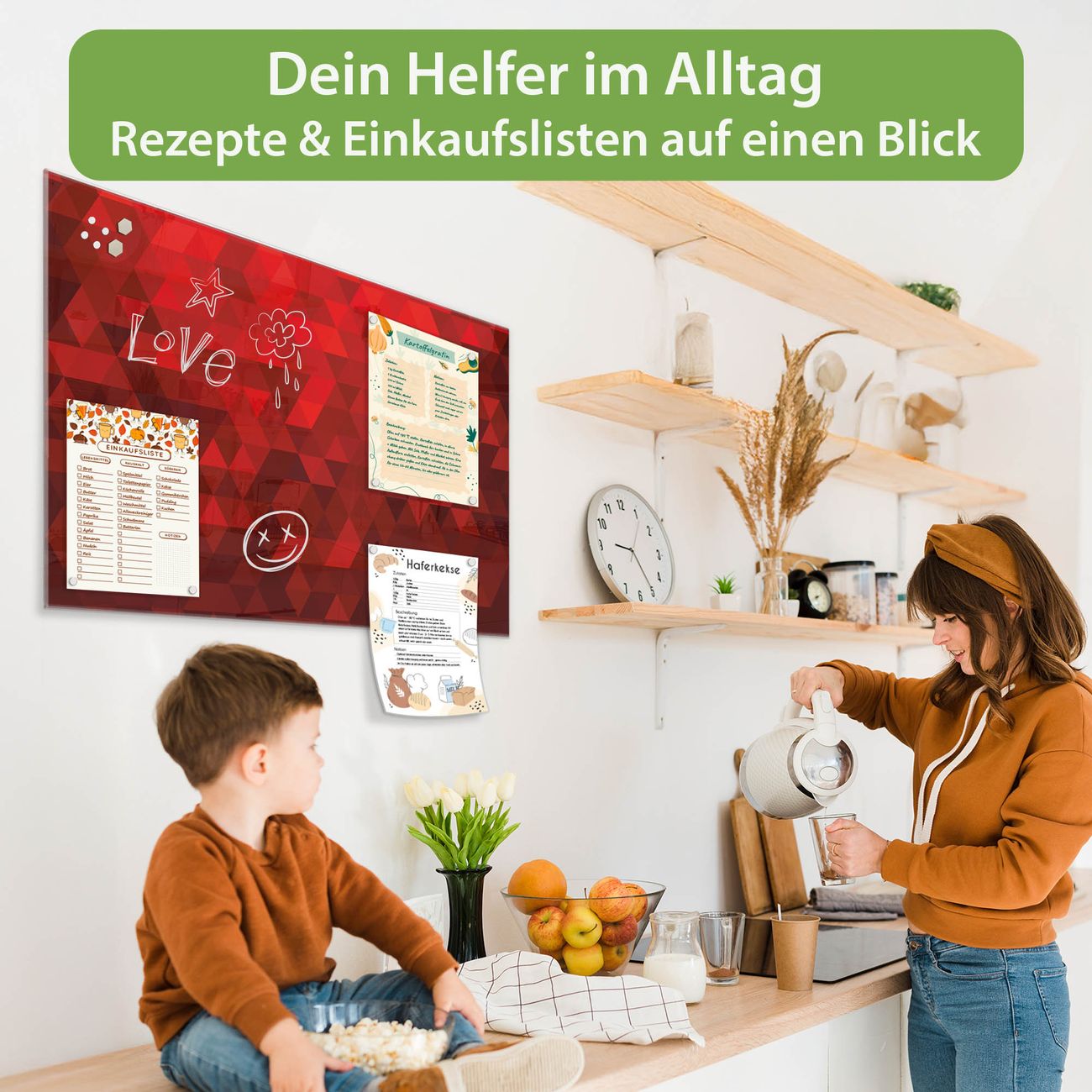 Auf der glatten Glasoberfläche lassen sich Termine, Rezepte oder Notizen ganz einfach mit Kreidestiften festhalten und rückstandslos entfernen. Starke Neodym-Magnete halten Ihre wichtigsten Erinnerungen sicher an Ort und Stelle. So entsteht Ihre ganz persönliche Ideenwand - jeden Tag neu.