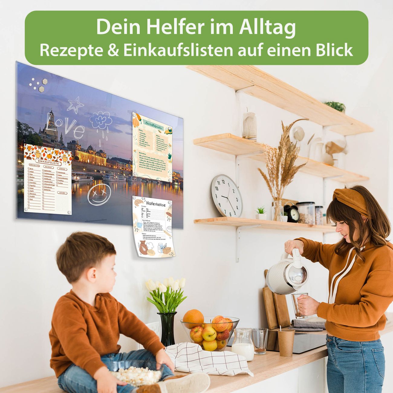 Ein Stück Design, das Ihren Alltag organisiert. Schreiben, heften, inspirieren - alles an einem Ort. Qualität, die man spürt. Montage leicht gemacht. Handwerk mit Herz - veredelt in Sachsen. Einzigartiges Design mit Motiv Motiv Dresden Beschreibbare Glasoberfläche, leicht zu reinigen Starke Magnetkraft durch Stahlrückwand Inklusive 4 Neodym-Magneten Flexible Montageoptionen Handveredelt in Sachsen - Qualität, die bleibt