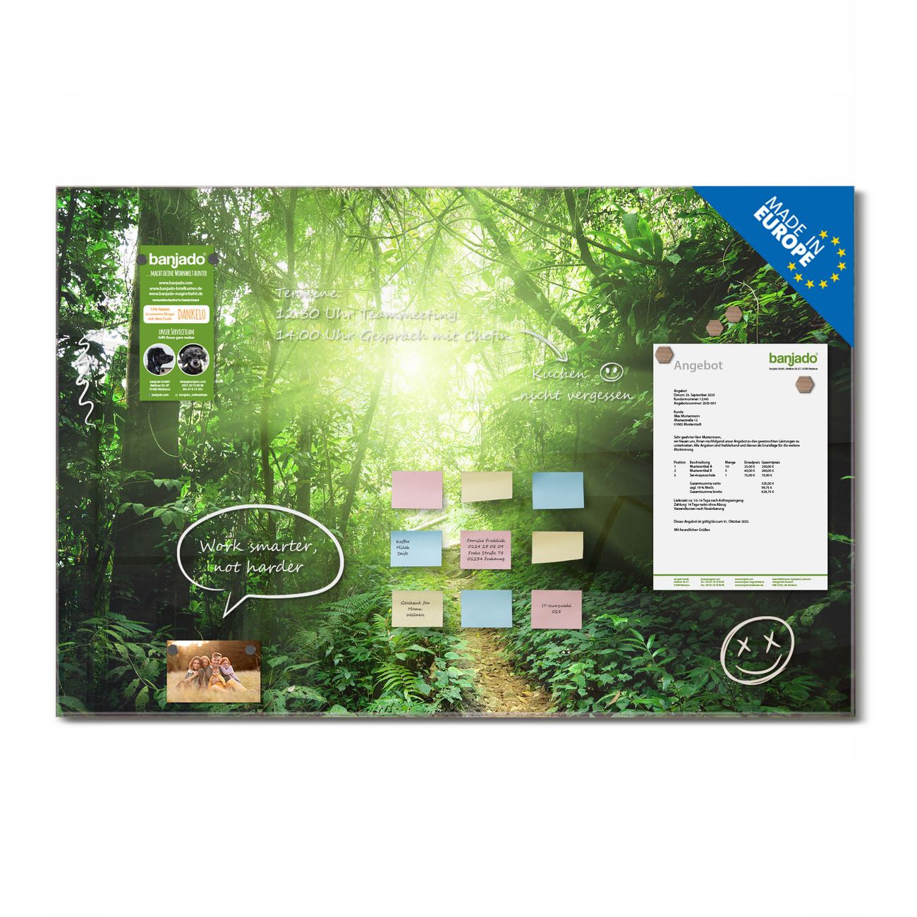Jede Glas Magnettafel wird in unserer Werkstatt von Hand gefertigt und sorgfältig geprüft. So erhalten Sie ein echtes Qualitätsprodukt, das Funktion und Ästhetik perfekt vereint.?? Warum banjado?