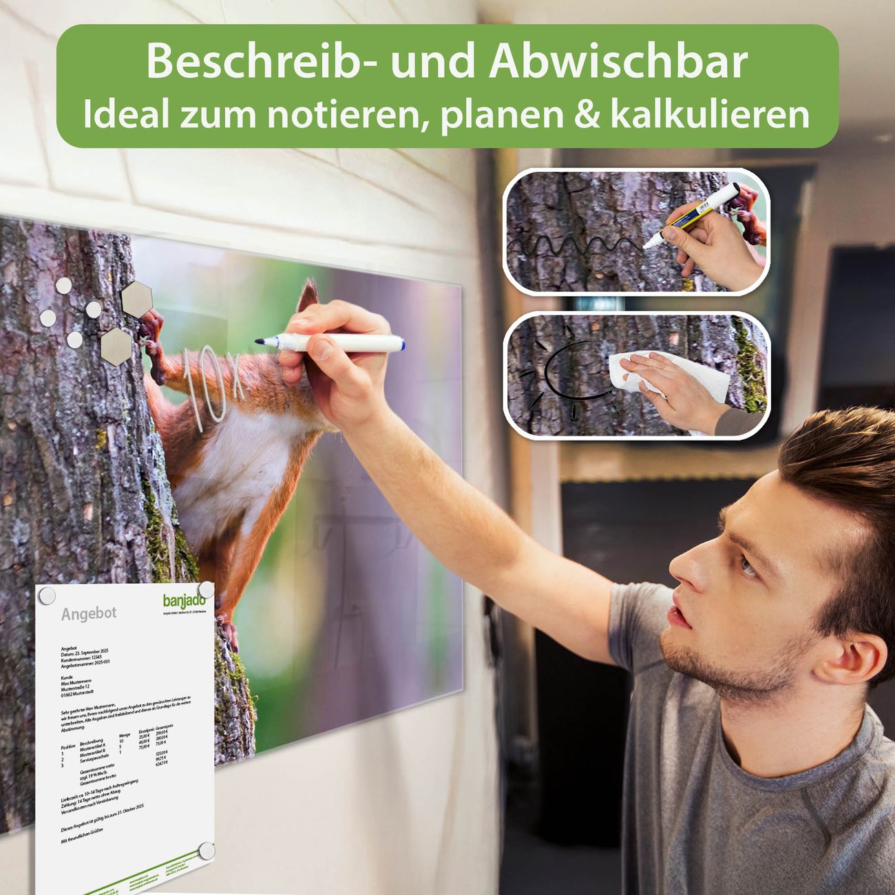 Jede Glas Magnettafel wird in unserer Werkstatt von Hand gefertigt und sorgfältig geprüft. So erhalten Sie ein echtes Qualitätsprodukt, das Funktion und Ästhetik perfekt vereint.?? Warum banjado?