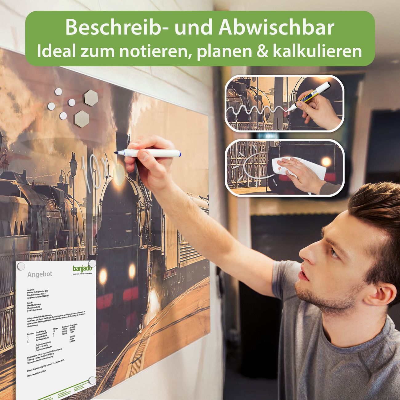Die banjado Glas Magnettafel mit dem Motiv Motiv Einfahrender Zug verbindet Funktionalität mit Stil. Sie ersetzt das Zettelchaos durch klare Strukturen und bringt dabei eine warme, natürliche Atmosphäre in Ihr Zuhause. Ob im Büro, in der Küche oder im Eingangsbereich - dieses Design-Board zieht Blicke an und sorgt für Ordnung mit Charakter.