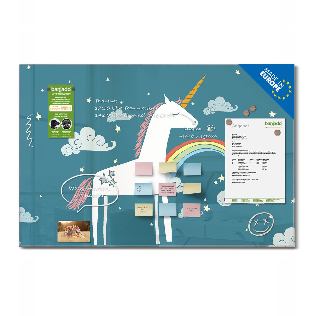 Ein Stück Design, das Ihren Alltag organisiert. Schreiben, heften, inspirieren - alles an einem Ort. Qualität, die man spürt. Montage leicht gemacht. Handwerk mit Herz - veredelt in Sachsen. Einzigartiges Design mit Motiv Motiv Einhorn Beschreibbare Glasoberfläche, leicht zu reinigen Starke Magnetkraft durch Stahlrückwand Inklusive 4 Neodym-Magneten Flexible Montageoptionen Handveredelt in Sachsen - Qualität, die bleibt