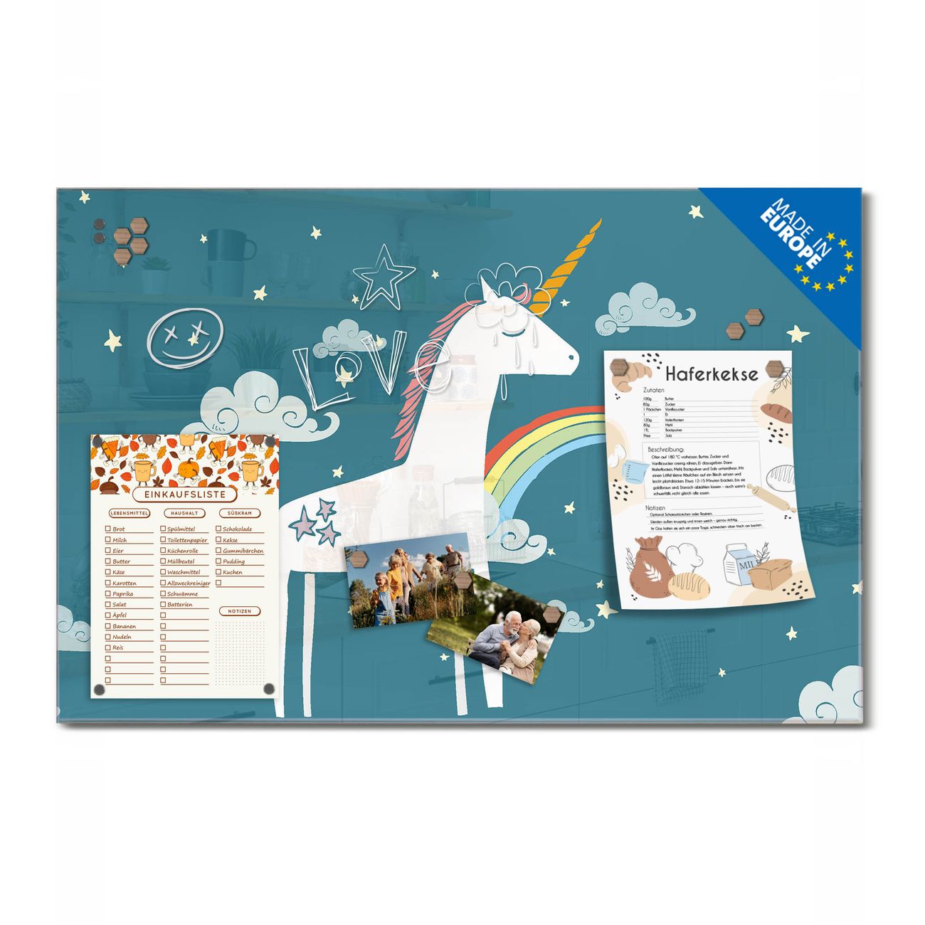 Ein Stück Design, das Ihren Alltag organisiert. Schreiben, heften, inspirieren - alles an einem Ort. Qualität, die man spürt. Montage leicht gemacht. Handwerk mit Herz - veredelt in Sachsen. Einzigartiges Design mit Motiv Motiv Einhorn Beschreibbare Glasoberfläche, leicht zu reinigen Starke Magnetkraft durch Stahlrückwand Inklusive 4 Neodym-Magneten Flexible Montageoptionen Handveredelt in Sachsen - Qualität, die bleibt