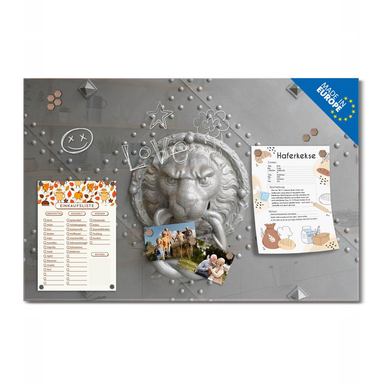 Ein Stück Design, das Ihren Alltag organisiert. Schreiben, heften, inspirieren - alles an einem Ort. Qualität, die man spürt. Montage leicht gemacht. Handwerk mit Herz - veredelt in Sachsen. Einzigartiges Design mit Motiv Motiv Eisentor Beschreibbare Glasoberfläche, leicht zu reinigen Starke Magnetkraft durch Stahlrückwand Inklusive 4 Neodym-Magneten Flexible Montageoptionen Handveredelt in Sachsen - Qualität, die bleibt