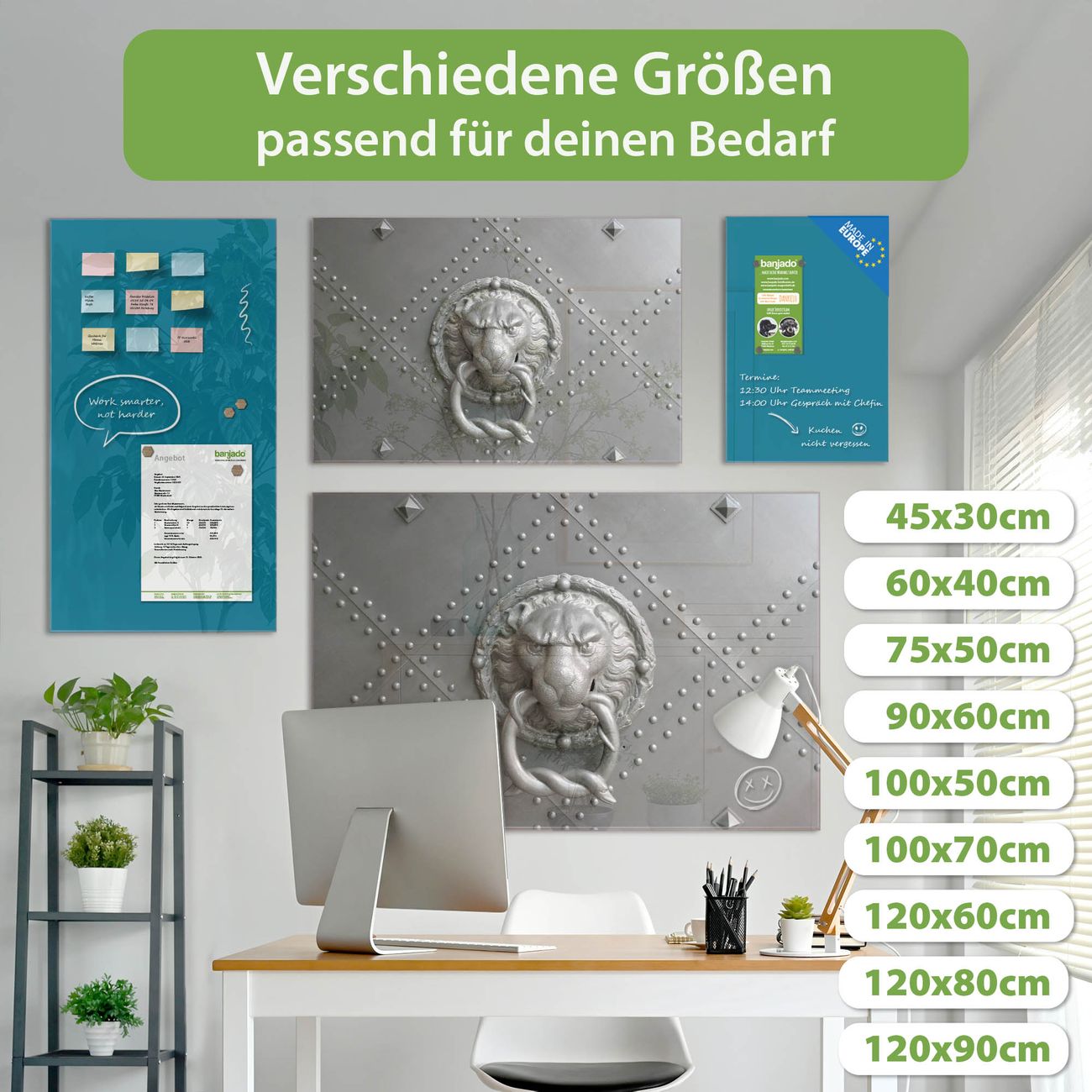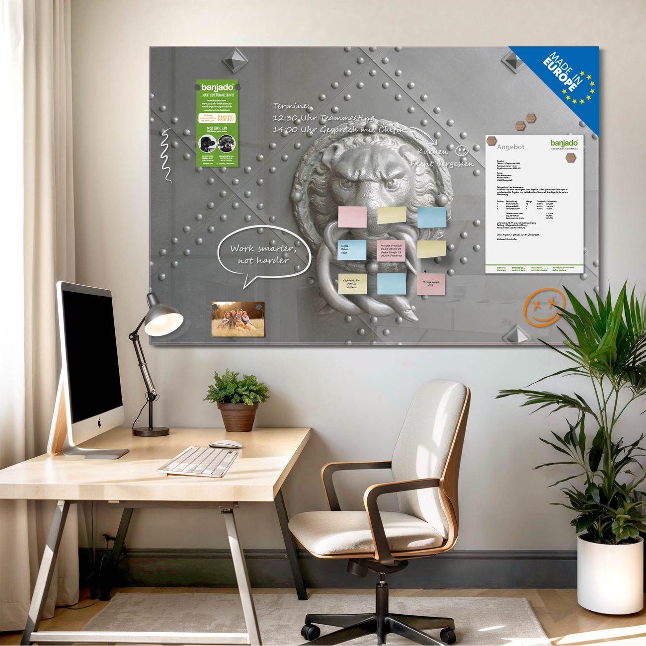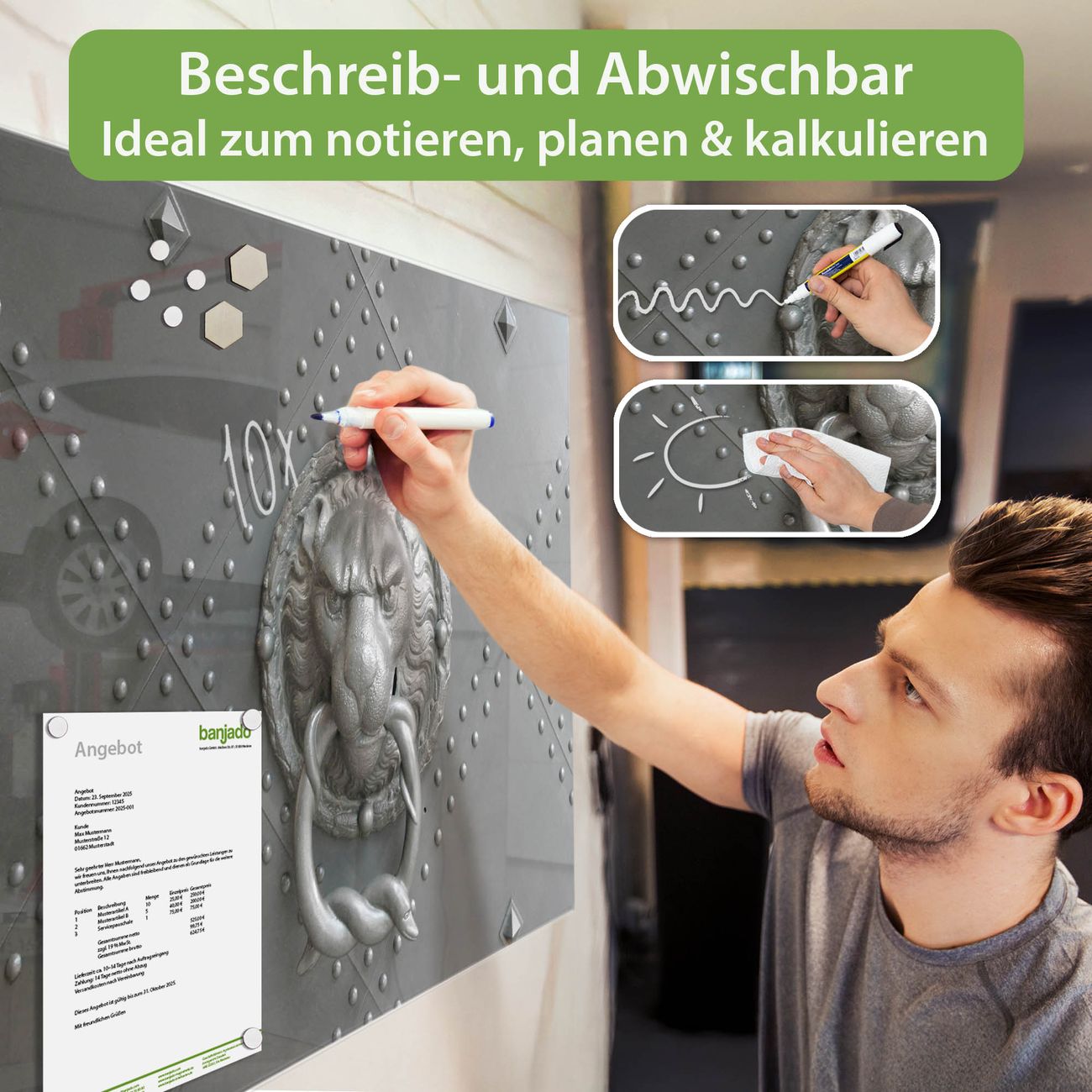 Jede Glas Magnettafel wird in unserer Werkstatt von Hand gefertigt und sorgfältig geprüft. So erhalten Sie ein echtes Qualitätsprodukt, das Funktion und Ästhetik perfekt vereint.?? Warum banjado?