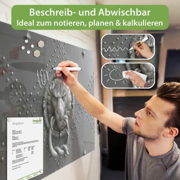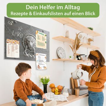 Auf der glatten Glasoberfläche lassen sich Termine, Rezepte oder Notizen ganz einfach mit Kreidestiften festhalten und rückstandslos entfernen. Starke Neodym-Magnete halten Ihre wichtigsten Erinnerungen sicher an Ort und Stelle. So entsteht Ihre ganz persönliche Ideenwand - jeden Tag neu.