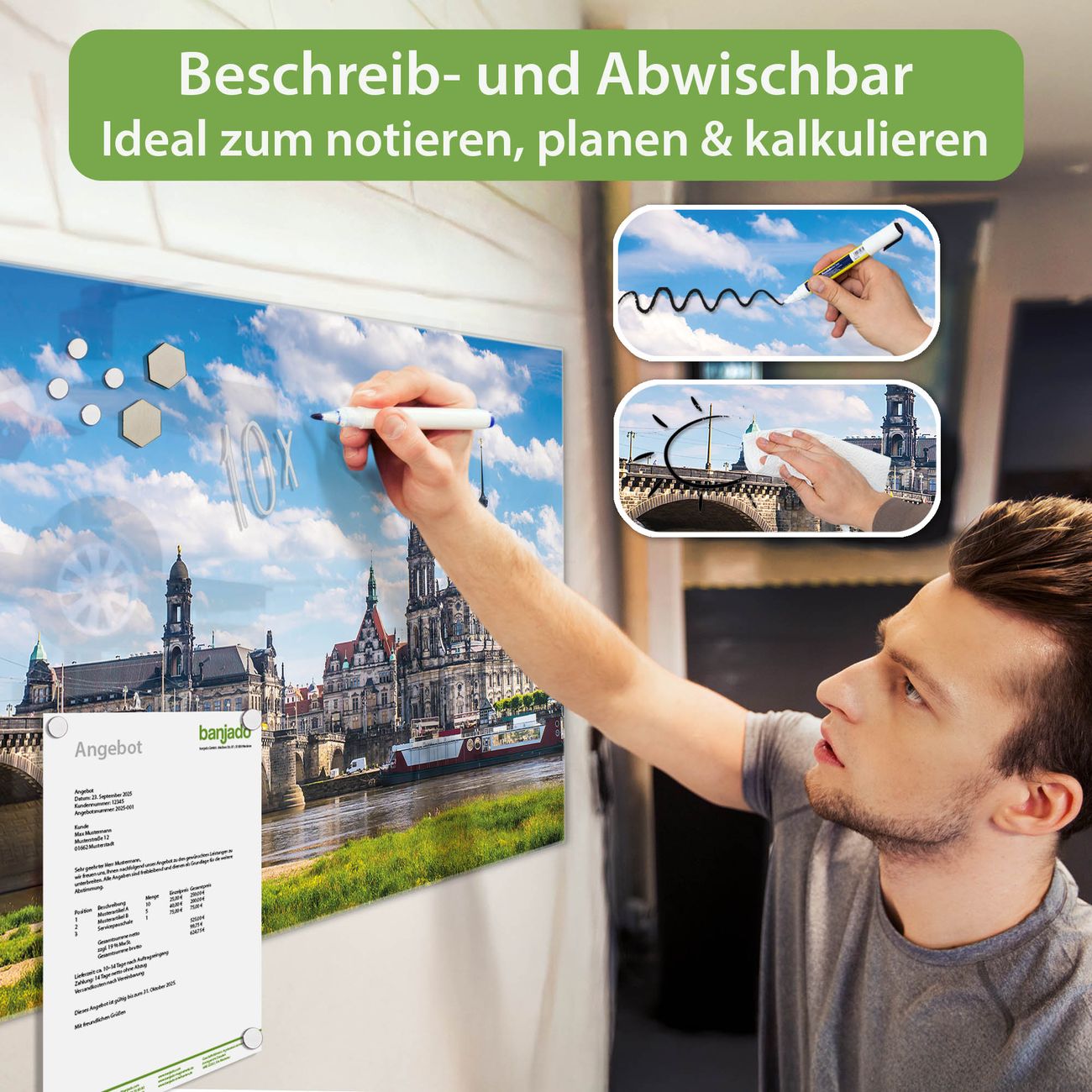 Die banjado Glas Magnettafel mit dem Motiv Motiv Elbflorenz verbindet Funktionalität mit Stil. Sie ersetzt das Zettelchaos durch klare Strukturen und bringt dabei eine warme, natürliche Atmosphäre in Ihr Zuhause. Ob im Büro, in der Küche oder im Eingangsbereich - dieses Design-Board zieht Blicke an und sorgt für Ordnung mit Charakter.