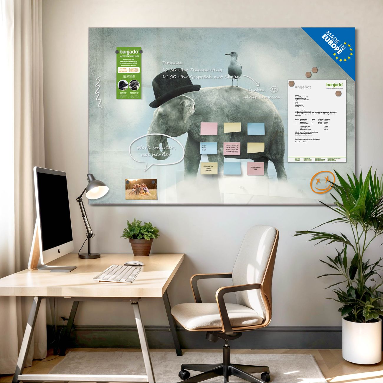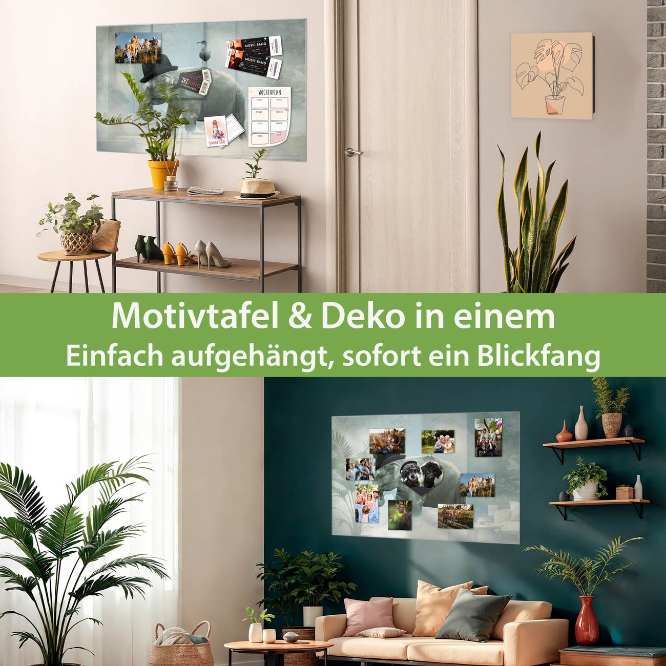 Die banjado Glas Magnettafel mit dem Motiv Motiv Elefant und Möwe verbindet Funktionalität mit Stil. Sie ersetzt das Zettelchaos durch klare Strukturen und bringt dabei eine warme, natürliche Atmosphäre in Ihr Zuhause. Ob im Büro, in der Küche oder im Eingangsbereich - dieses Design-Board zieht Blicke an und sorgt für Ordnung mit Charakter.