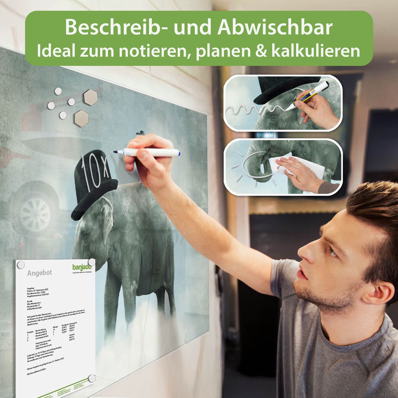 Bitte beachten Sie, dass ausschliessliche spezielle Magnete an der Glastafel haften. Wir empfehlen banjado Neodym Magnete, diese sind durch uns auf Wirksamkeit geprüft.