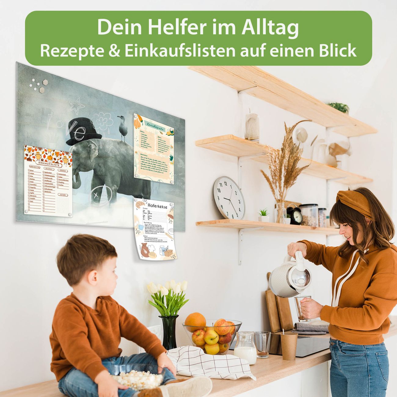 Ein Stück Design, das Ihren Alltag organisiert. Schreiben, heften, inspirieren - alles an einem Ort. Qualität, die man spürt. Montage leicht gemacht. Handwerk mit Herz - veredelt in Sachsen. Einzigartiges Design mit Motiv Motiv Elefant und Möwe Beschreibbare Glasoberfläche, leicht zu reinigen Starke Magnetkraft durch Stahlrückwand Inklusive 4 Neodym-Magneten Flexible Montageoptionen Handveredelt in Sachsen - Qualität, die bleibt