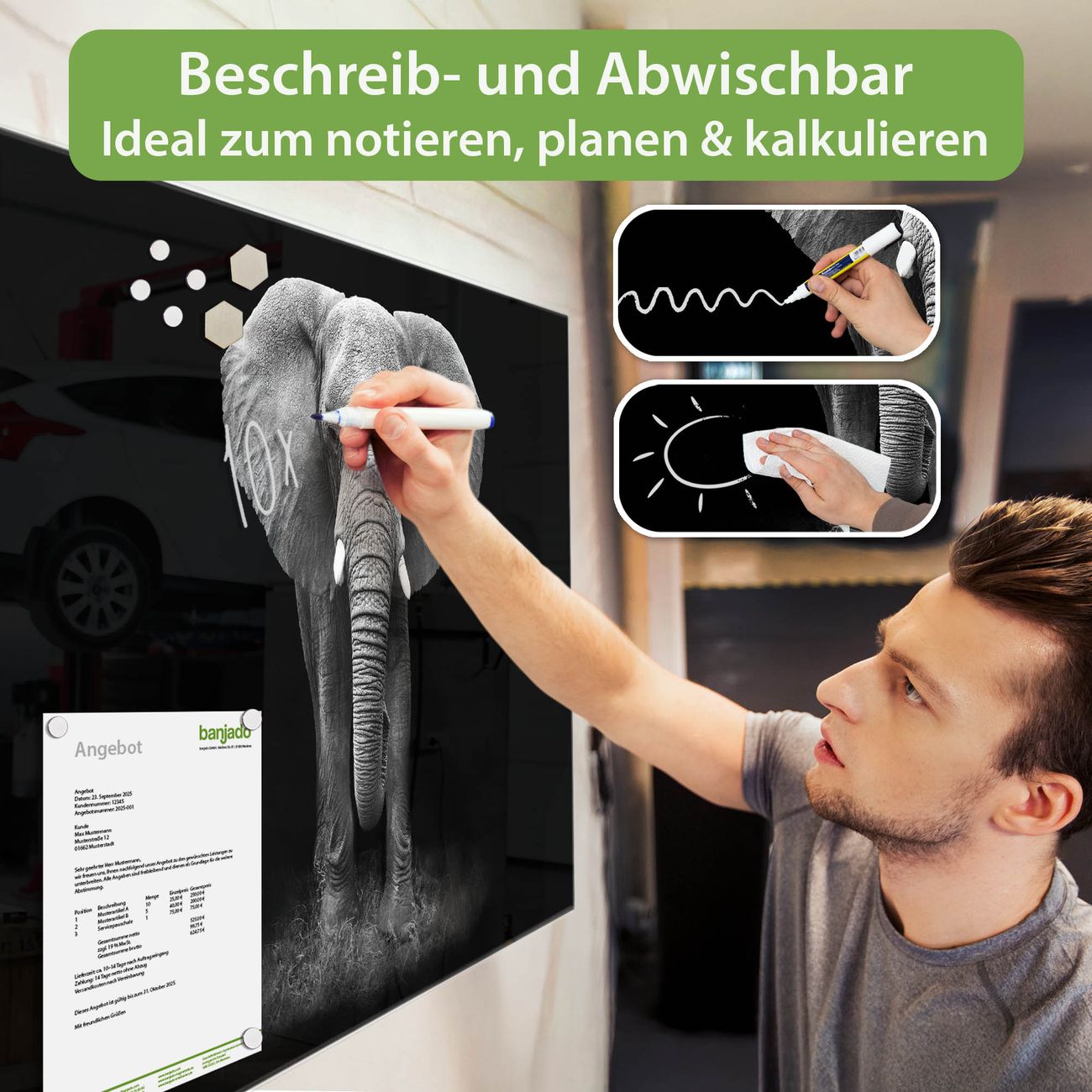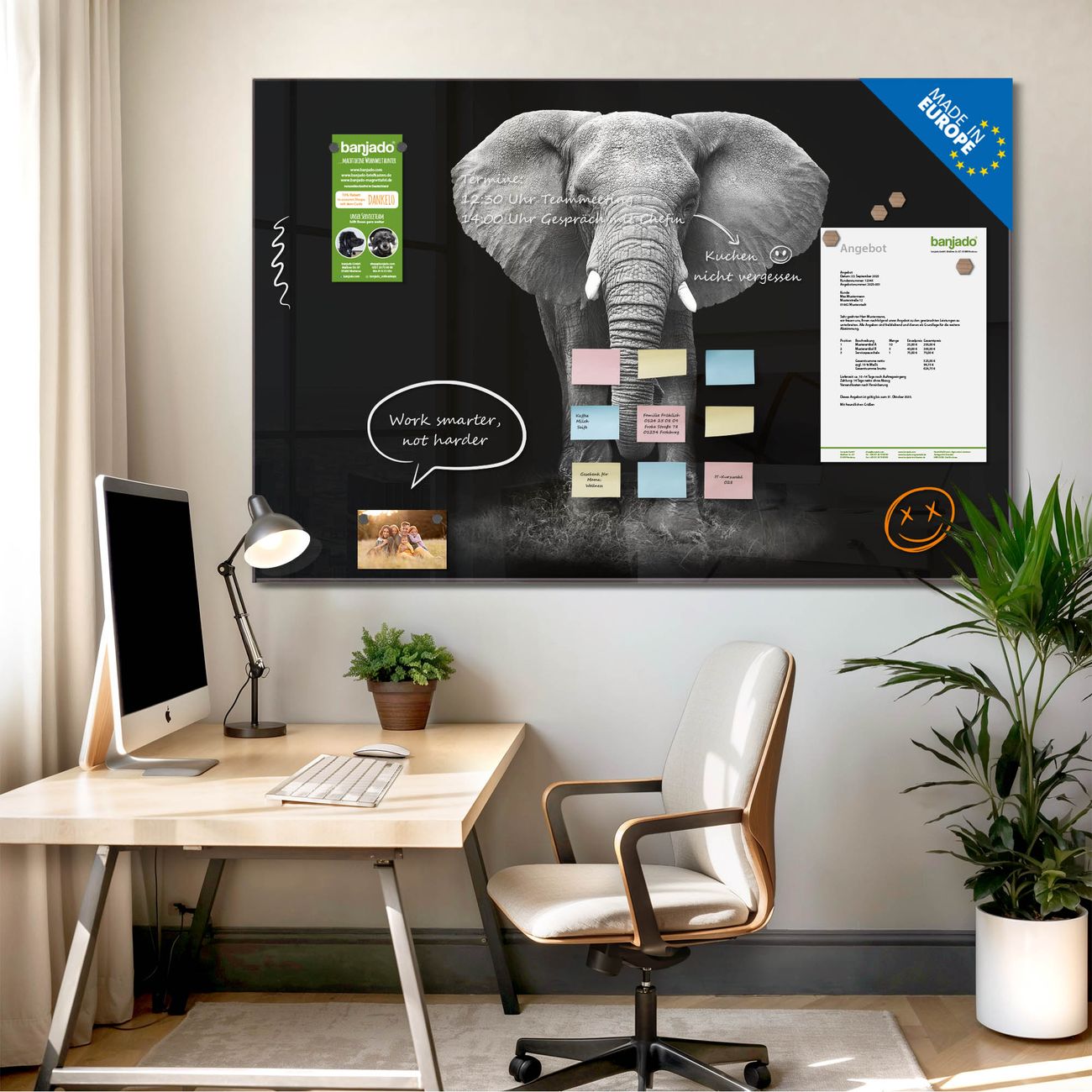 Jede Glas Magnettafel wird in unserer Werkstatt von Hand gefertigt und sorgfältig geprüft. So erhalten Sie ein echtes Qualitätsprodukt, das Funktion und Ästhetik perfekt vereint.?? Warum banjado?