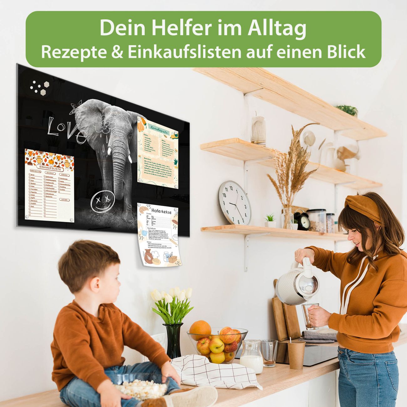 Auf der glatten Glasoberfläche lassen sich Termine, Rezepte oder Notizen ganz einfach mit Kreidestiften festhalten und rückstandslos entfernen. Starke Neodym-Magnete halten Ihre wichtigsten Erinnerungen sicher an Ort und Stelle. So entsteht Ihre ganz persönliche Ideenwand - jeden Tag neu.