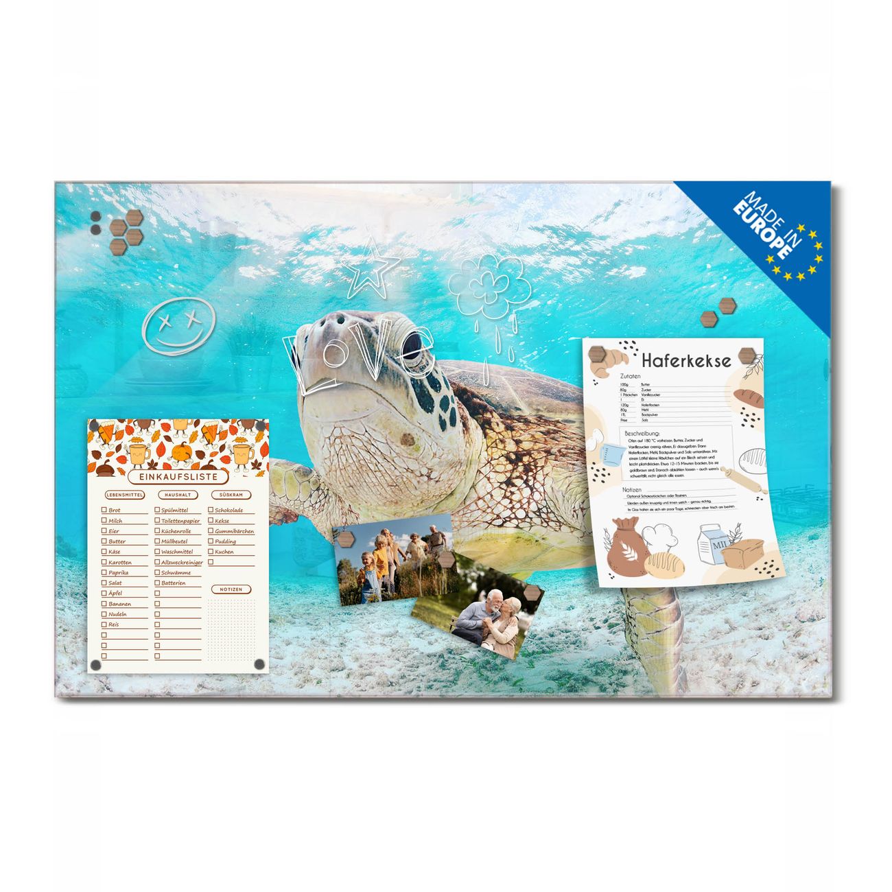 Auf der glatten Glasoberfläche lassen sich Termine, Rezepte oder Notizen ganz einfach mit Kreidestiften festhalten und rückstandslos entfernen. Starke Neodym-Magnete halten Ihre wichtigsten Erinnerungen sicher an Ort und Stelle. So entsteht Ihre ganz persönliche Ideenwand - jeden Tag neu.