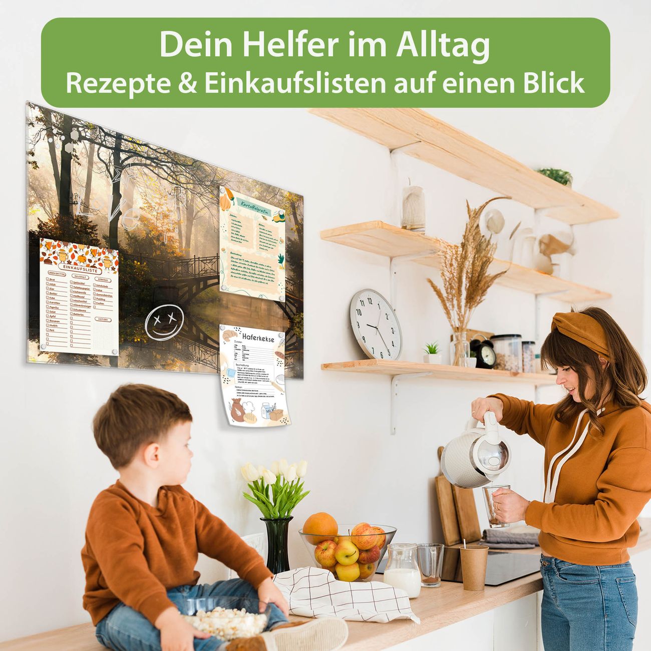 Auf der glatten Glasoberfläche lassen sich Termine, Rezepte oder Notizen ganz einfach mit Kreidestiften festhalten und rückstandslos entfernen. Starke Neodym-Magnete halten Ihre wichtigsten Erinnerungen sicher an Ort und Stelle. So entsteht Ihre ganz persönliche Ideenwand - jeden Tag neu.