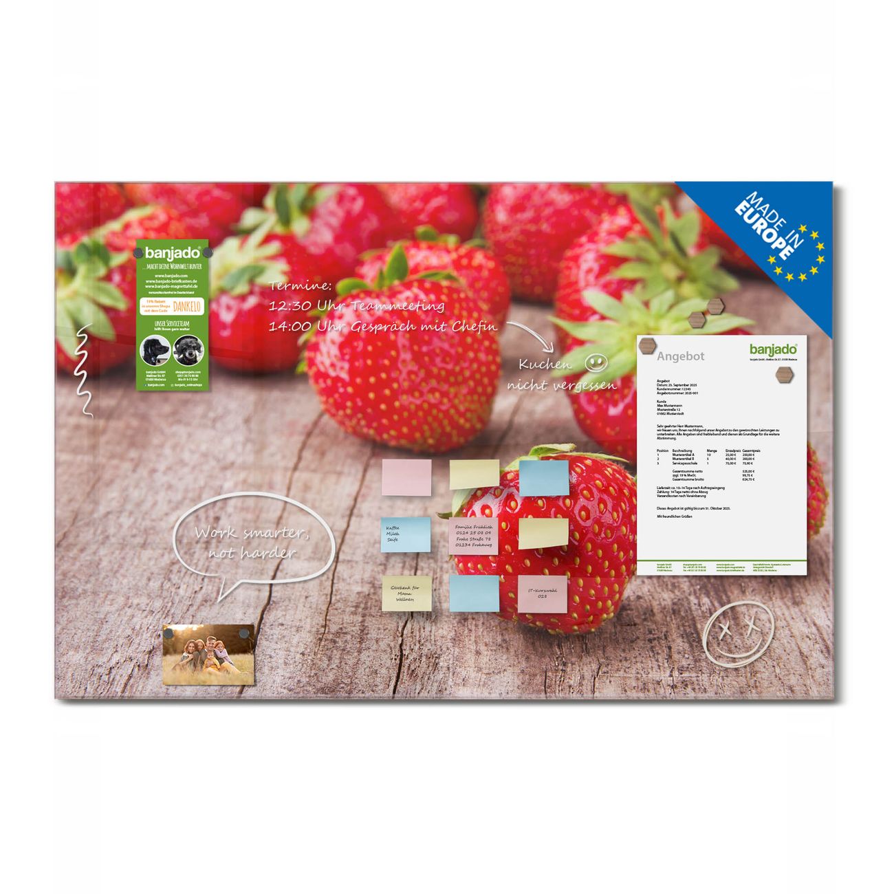 Ein Stück Design, das Ihren Alltag organisiert. Schreiben, heften, inspirieren - alles an einem Ort. Qualität, die man spürt. Montage leicht gemacht. Handwerk mit Herz - veredelt in Sachsen. Einzigartiges Design mit Motiv Motiv Erdbeeren Beschreibbare Glasoberfläche, leicht zu reinigen Starke Magnetkraft durch Stahlrückwand Inklusive 4 Neodym-Magneten Flexible Montageoptionen Handveredelt in Sachsen - Qualität, die bleibt