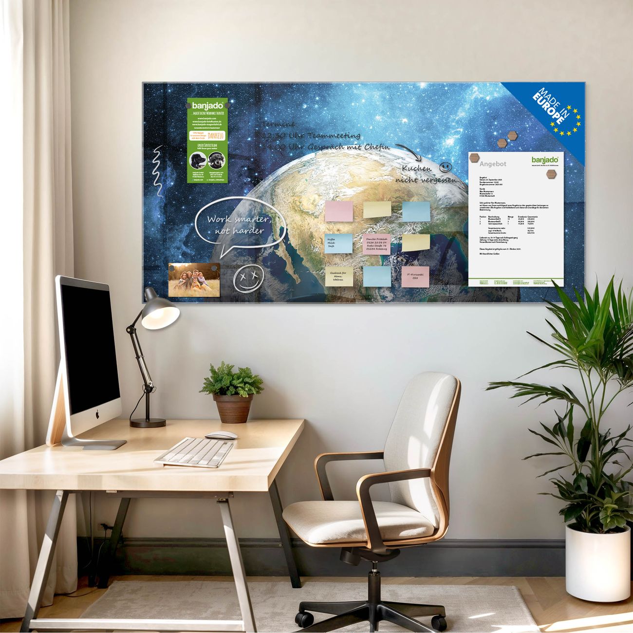 Jede Glas Magnettafel wird in unserer Werkstatt von Hand gefertigt und sorgfältig geprüft. So erhalten Sie ein echtes Qualitätsprodukt, das Funktion und Ästhetik perfekt vereint.?? Warum banjado?