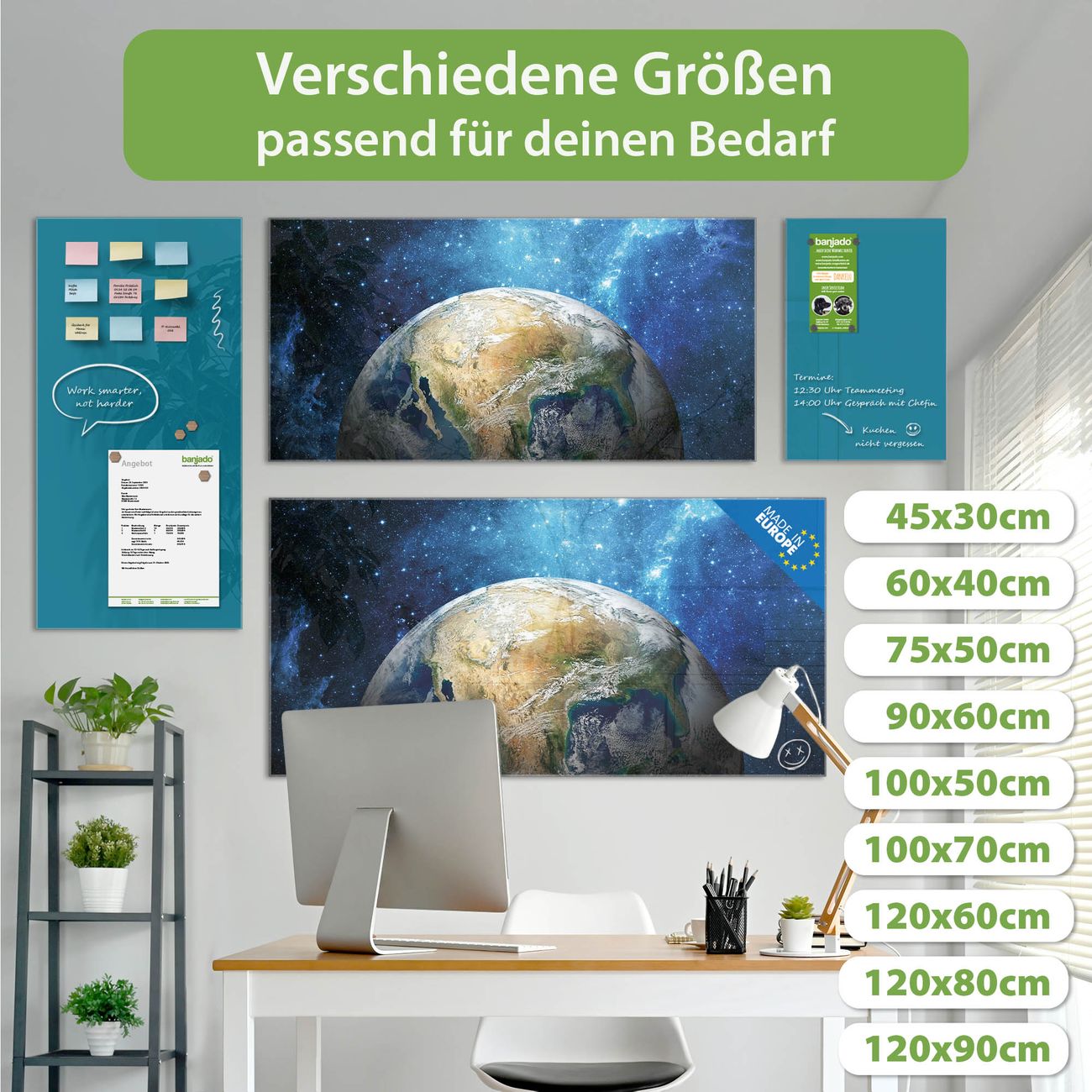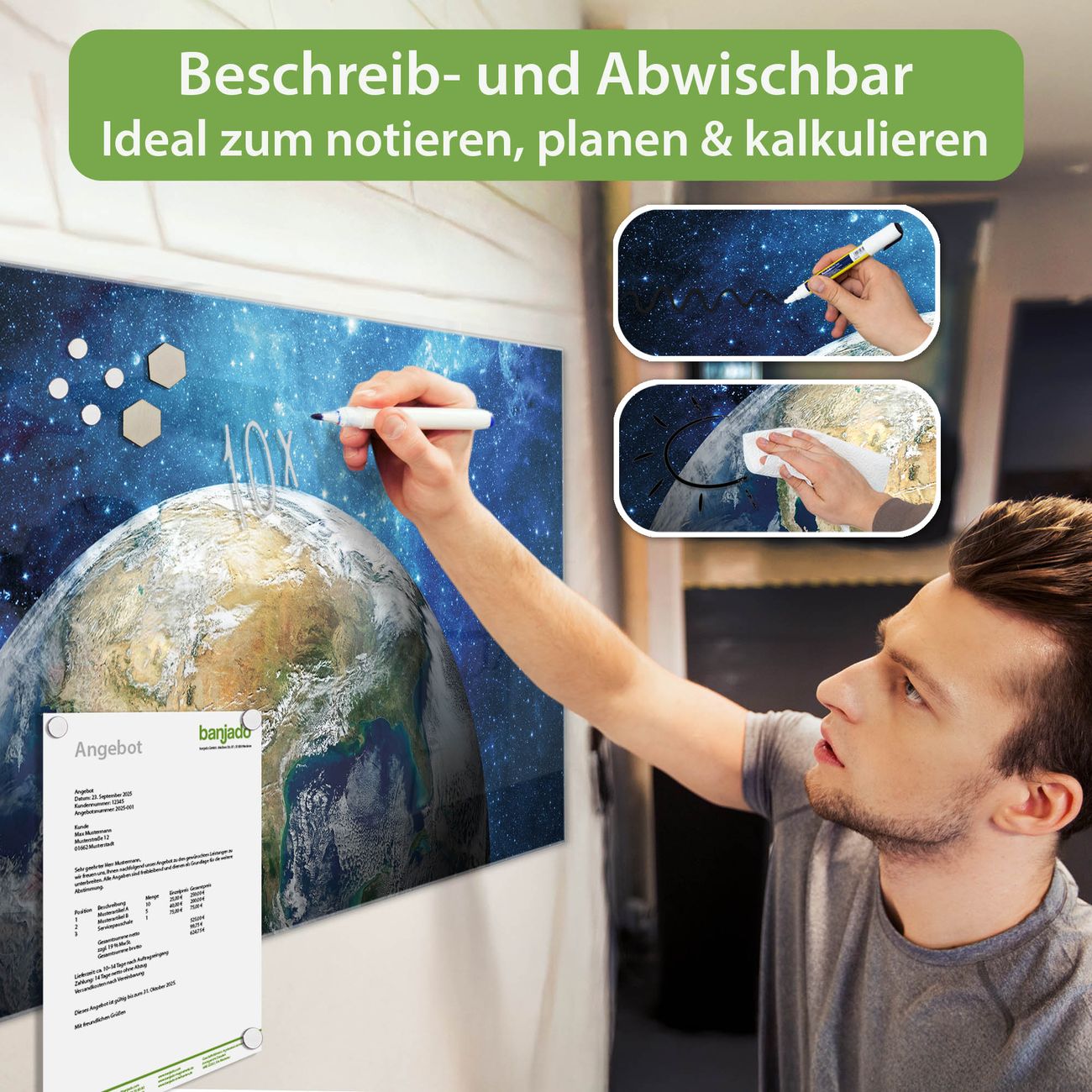 Ein Stück Design, das Ihren Alltag organisiert. Schreiben, heften, inspirieren - alles an einem Ort. Qualität, die man spürt. Montage leicht gemacht. Handwerk mit Herz - veredelt in Sachsen. Einzigartiges Design mit Motiv Motiv Erdkugel Beschreibbare Glasoberfläche, leicht zu reinigen Starke Magnetkraft durch Stahlrückwand Inklusive 4 Neodym-Magneten Flexible Montageoptionen Handveredelt in Sachsen - Qualität, die bleibt