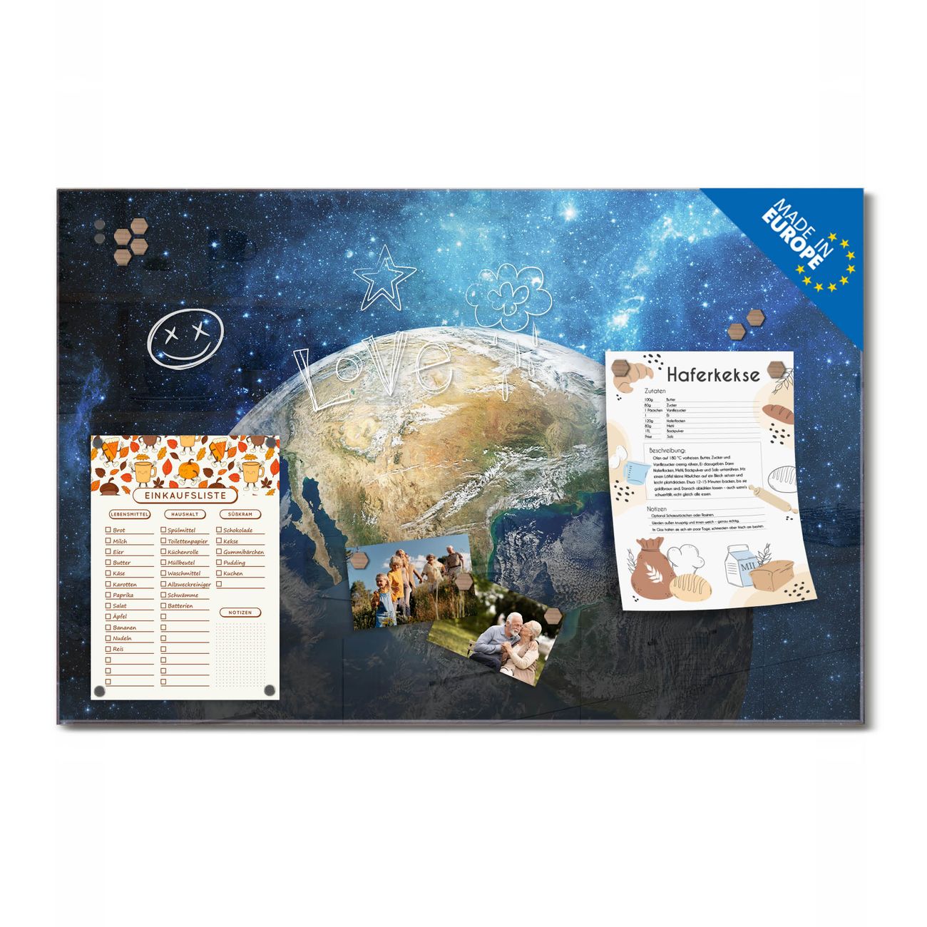 Ein Stück Design, das Ihren Alltag organisiert. Schreiben, heften, inspirieren - alles an einem Ort. Qualität, die man spürt. Montage leicht gemacht. Handwerk mit Herz - veredelt in Sachsen. Einzigartiges Design mit Motiv Motiv Erdkugel Beschreibbare Glasoberfläche, leicht zu reinigen Starke Magnetkraft durch Stahlrückwand Inklusive 4 Neodym-Magneten Flexible Montageoptionen Handveredelt in Sachsen - Qualität, die bleibt