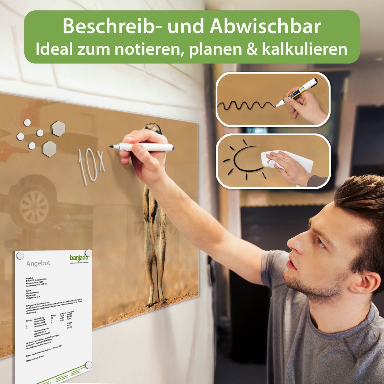 Jede Glas Magnettafel wird in unserer Werkstatt von Hand gefertigt und sorgfältig geprüft. So erhalten Sie ein echtes Qualitätsprodukt, das Funktion und Ästhetik perfekt vereint.?? Warum banjado?