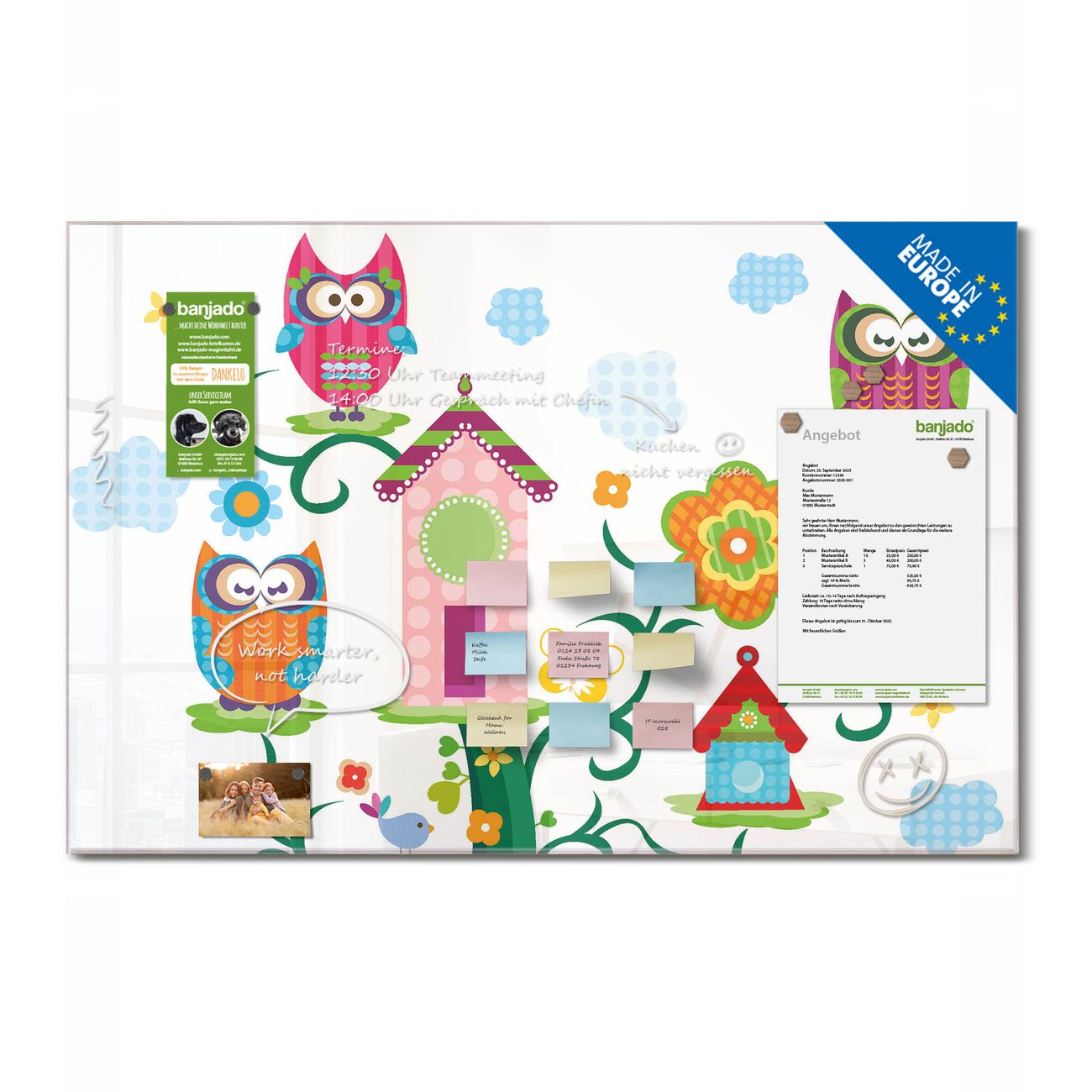 Ein Stück Design, das Ihren Alltag organisiert. Schreiben, heften, inspirieren - alles an einem Ort. Qualität, die man spürt. Montage leicht gemacht. Handwerk mit Herz - veredelt in Sachsen. Einzigartiges Design mit Motiv Motiv Eulenfamilie Beschreibbare Glasoberfläche, leicht zu reinigen Starke Magnetkraft durch Stahlrückwand Inklusive 4 Neodym-Magneten Flexible Montageoptionen Handveredelt in Sachsen - Qualität, die bleibt