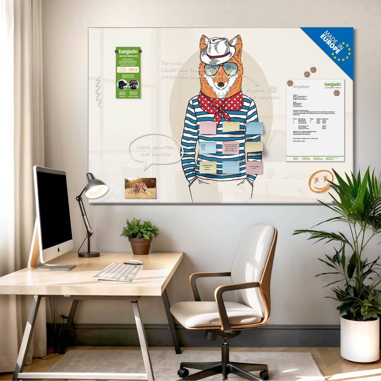 Jede Glas Magnettafel wird in unserer Werkstatt von Hand gefertigt und sorgfältig geprüft. So erhalten Sie ein echtes Qualitätsprodukt, das Funktion und Ästhetik perfekt vereint.?? Warum banjado?