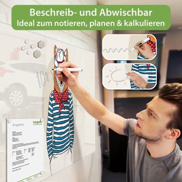 Auf der glatten Glasoberfläche lassen sich Termine, Rezepte oder Notizen ganz einfach mit Kreidestiften festhalten und rückstandslos entfernen. Starke Neodym-Magnete halten Ihre wichtigsten Erinnerungen sicher an Ort und Stelle. So entsteht Ihre ganz persönliche Ideenwand - jeden Tag neu.