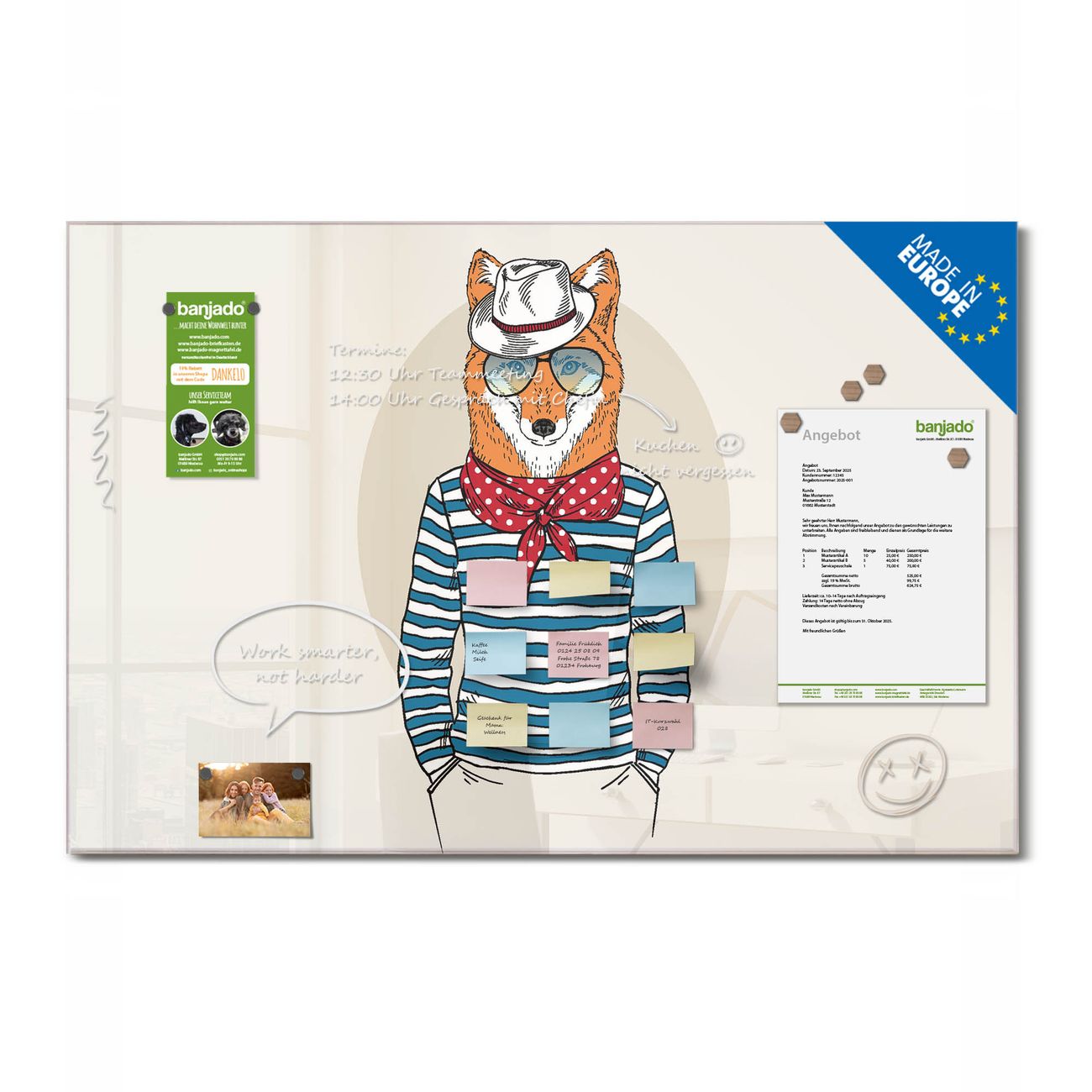 Jede Glas Magnettafel wird in unserer Werkstatt von Hand gefertigt und sorgfältig geprüft. So erhalten Sie ein echtes Qualitätsprodukt, das Funktion und Ästhetik perfekt vereint.?? Warum banjado?