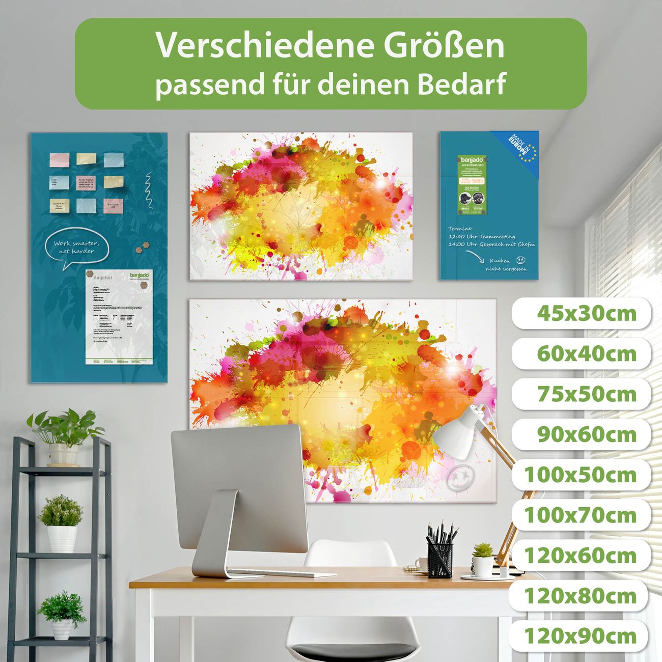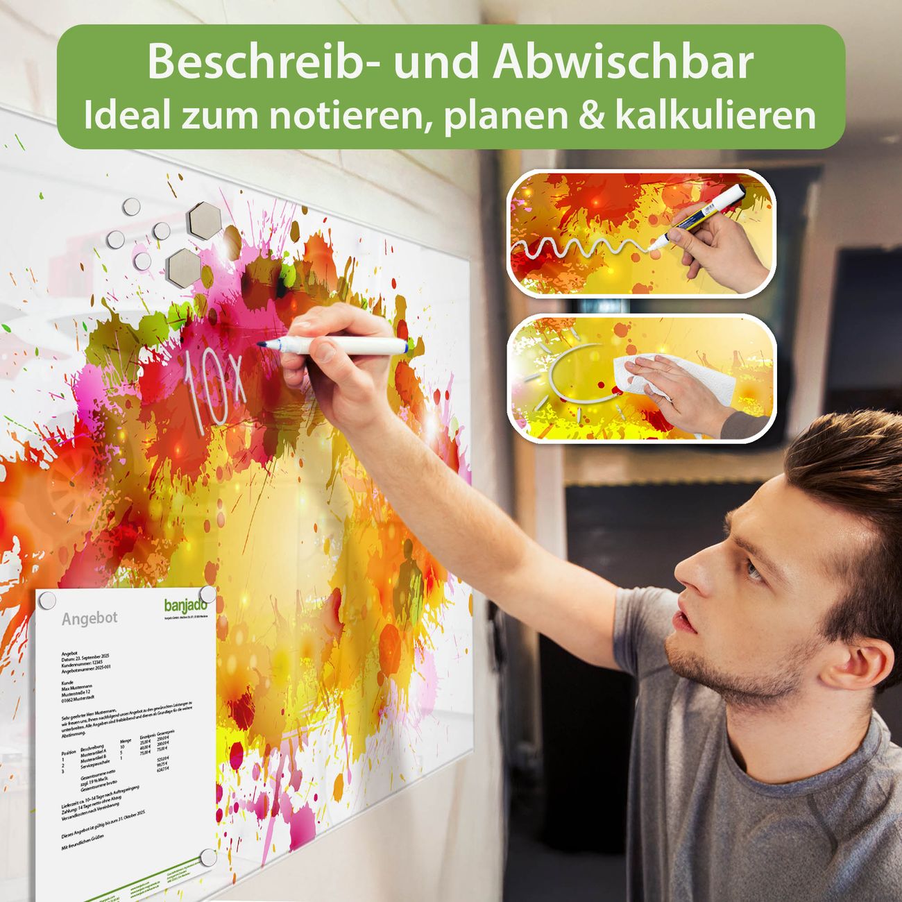 Jede Glas Magnettafel wird in unserer Werkstatt von Hand gefertigt und sorgfältig geprüft. So erhalten Sie ein echtes Qualitätsprodukt, das Funktion und Ästhetik perfekt vereint.?? Warum banjado?