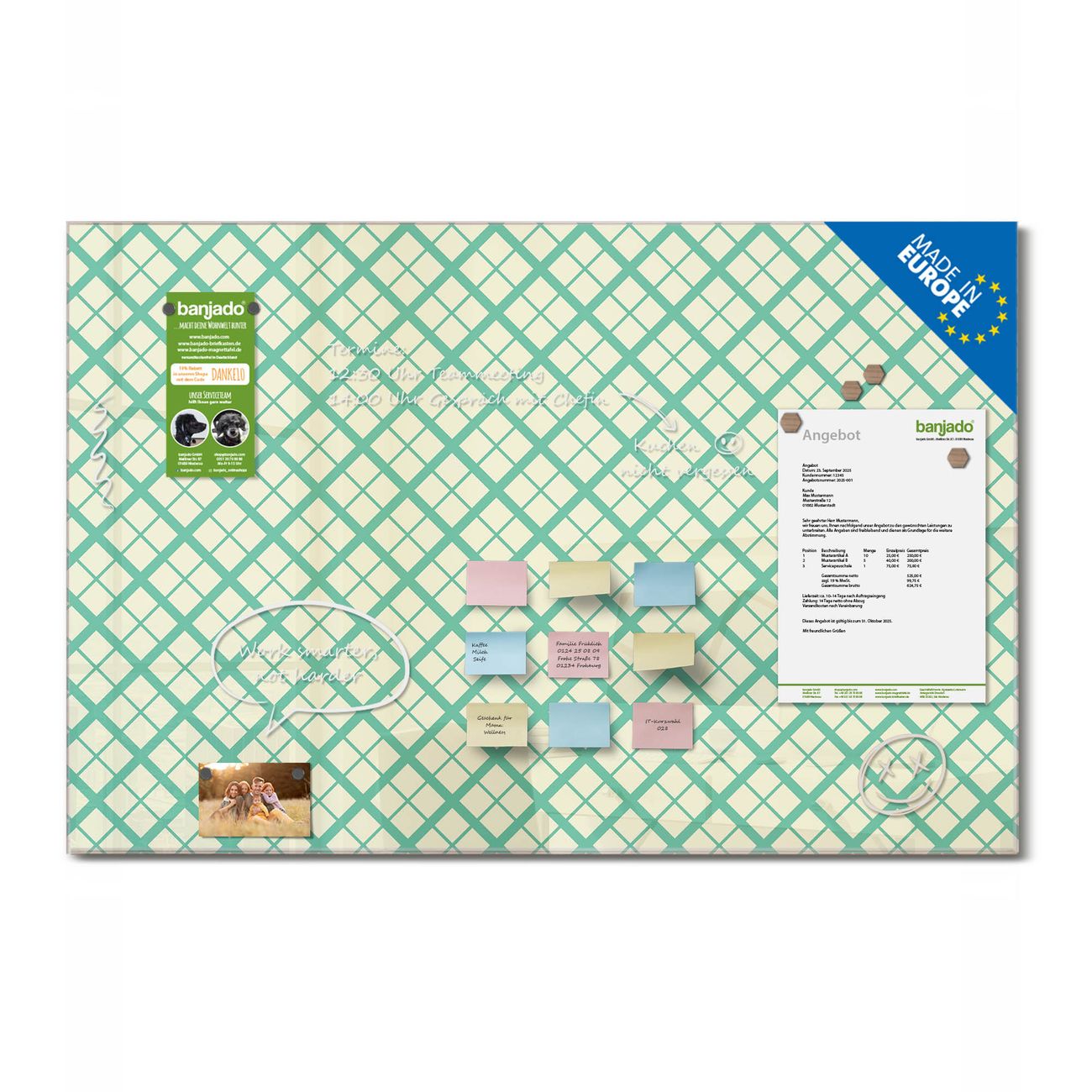 Jede Glas Magnettafel wird in unserer Werkstatt von Hand gefertigt und sorgfältig geprüft. So erhalten Sie ein echtes Qualitätsprodukt, das Funktion und Ästhetik perfekt vereint.?? Warum banjado?
