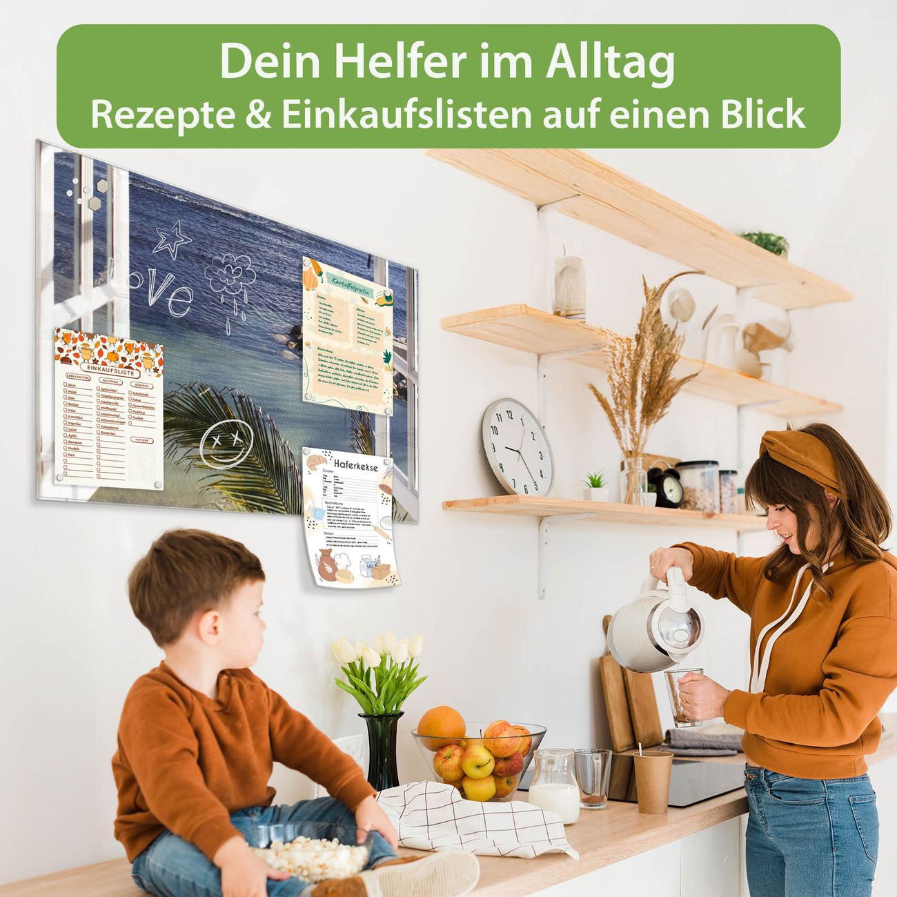 Auf der glatten Glasoberfläche lassen sich Termine, Rezepte oder Notizen ganz einfach mit Kreidestiften festhalten und rückstandslos entfernen. Starke Neodym-Magnete halten Ihre wichtigsten Erinnerungen sicher an Ort und Stelle. So entsteht Ihre ganz persönliche Ideenwand - jeden Tag neu.