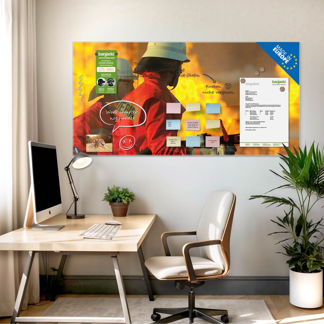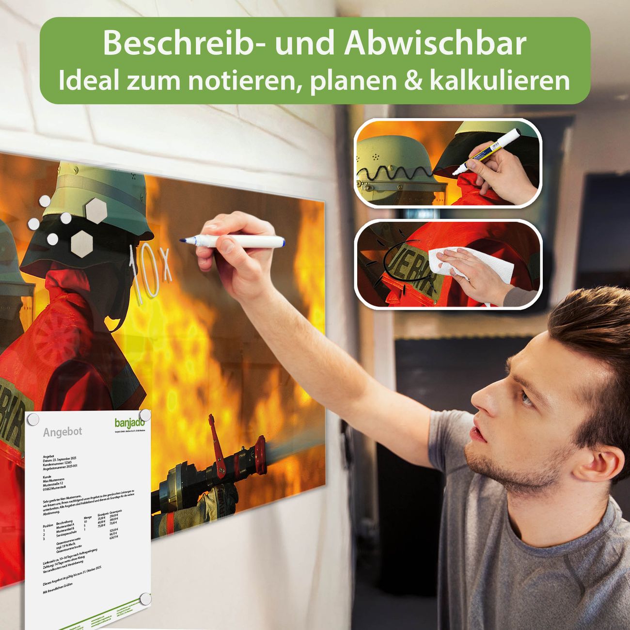 Jede Glas Magnettafel wird in unserer Werkstatt von Hand gefertigt und sorgfältig geprüft. So erhalten Sie ein echtes Qualitätsprodukt, das Funktion und Ästhetik perfekt vereint.?? Warum banjado?