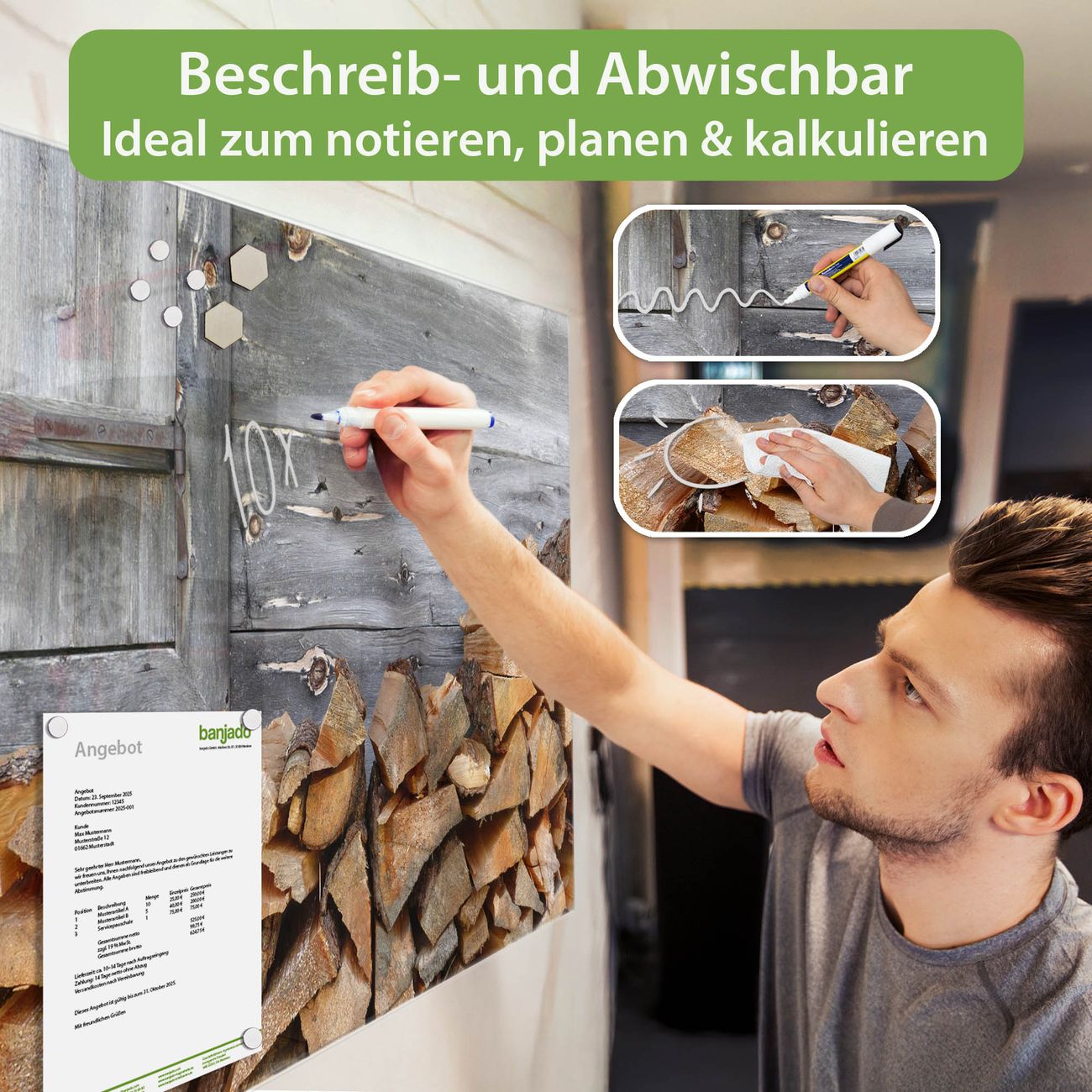Ein Stück Design, das Ihren Alltag organisiert. Schreiben, heften, inspirieren - alles an einem Ort. Qualität, die man spürt. Montage leicht gemacht. Handwerk mit Herz - veredelt in Sachsen. Einzigartiges Design mit Motiv Motiv Feuerholz Beschreibbare Glasoberfläche, leicht zu reinigen Starke Magnetkraft durch Stahlrückwand Inklusive 4 Neodym-Magneten Flexible Montageoptionen Handveredelt in Sachsen - Qualität, die bleibt