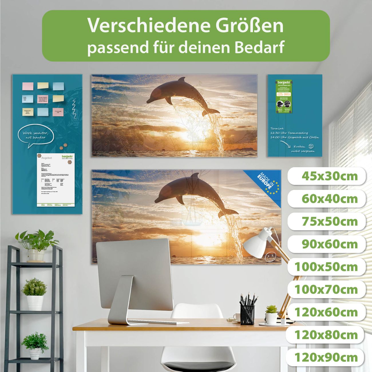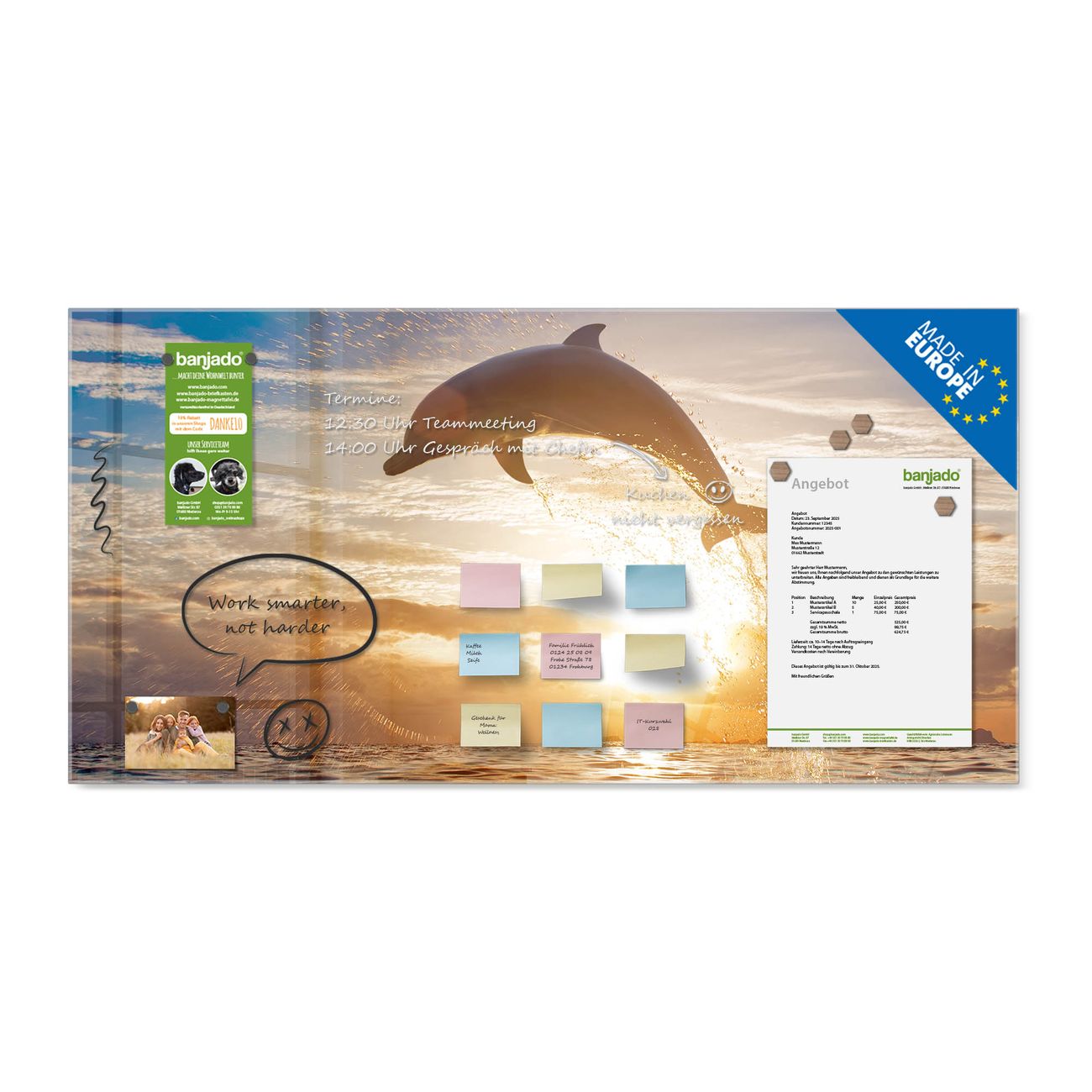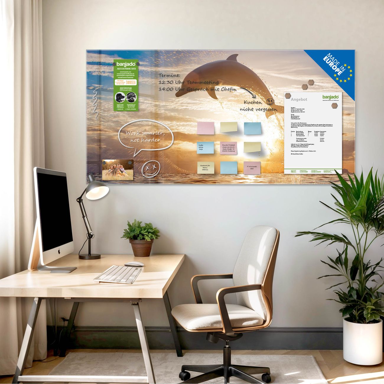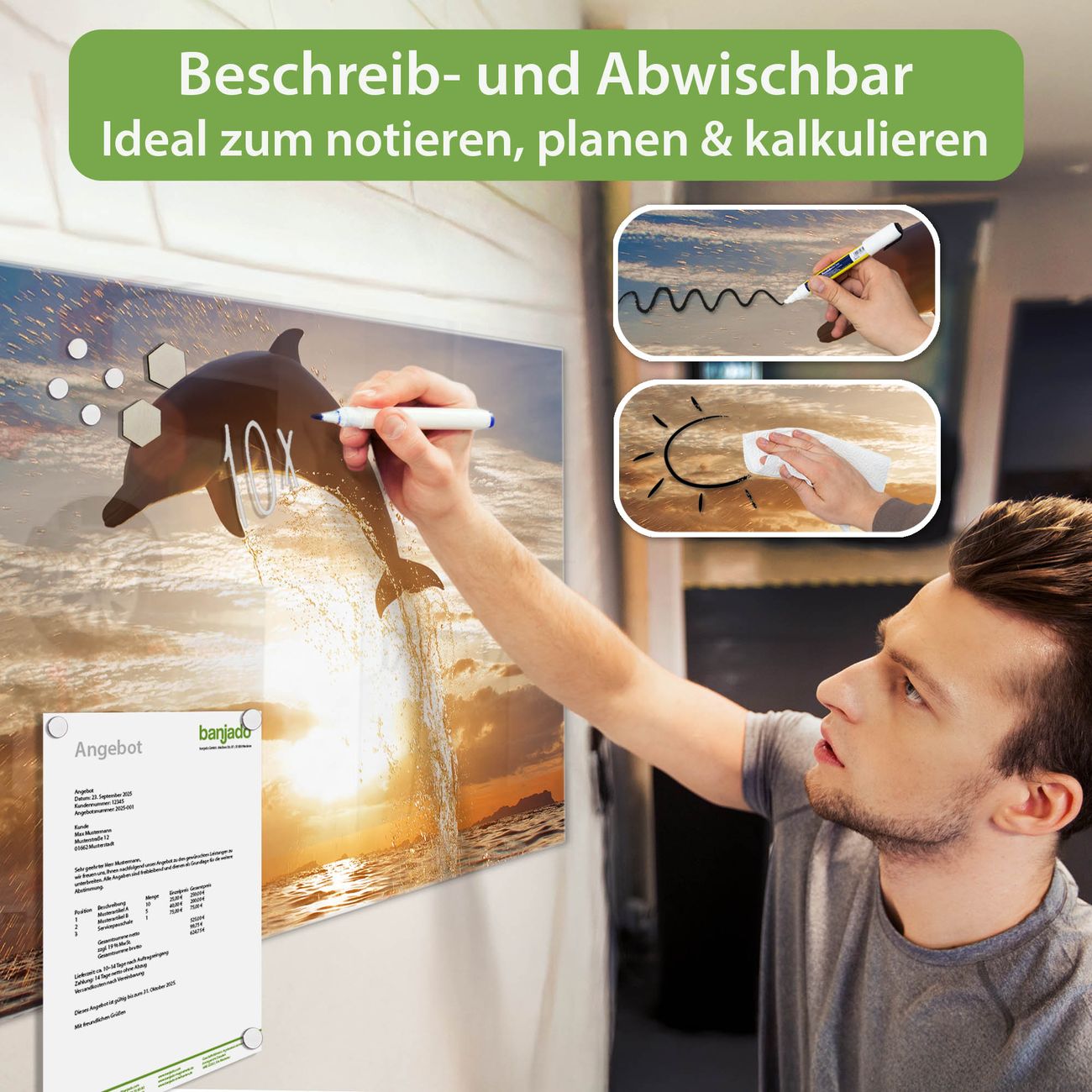 Jede Glas Magnettafel wird in unserer Werkstatt von Hand gefertigt und sorgfältig geprüft. So erhalten Sie ein echtes Qualitätsprodukt, das Funktion und Ästhetik perfekt vereint.?? Warum banjado?