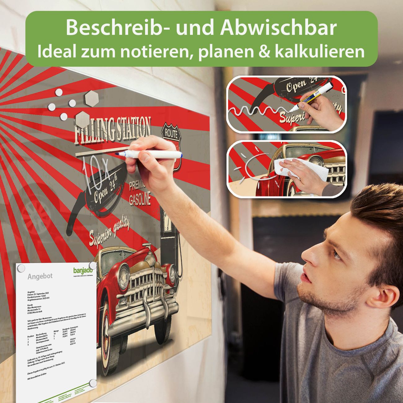 Jede Glas Magnettafel wird in unserer Werkstatt von Hand gefertigt und sorgfältig geprüft. So erhalten Sie ein echtes Qualitätsprodukt, das Funktion und Ästhetik perfekt vereint.?? Warum banjado?
