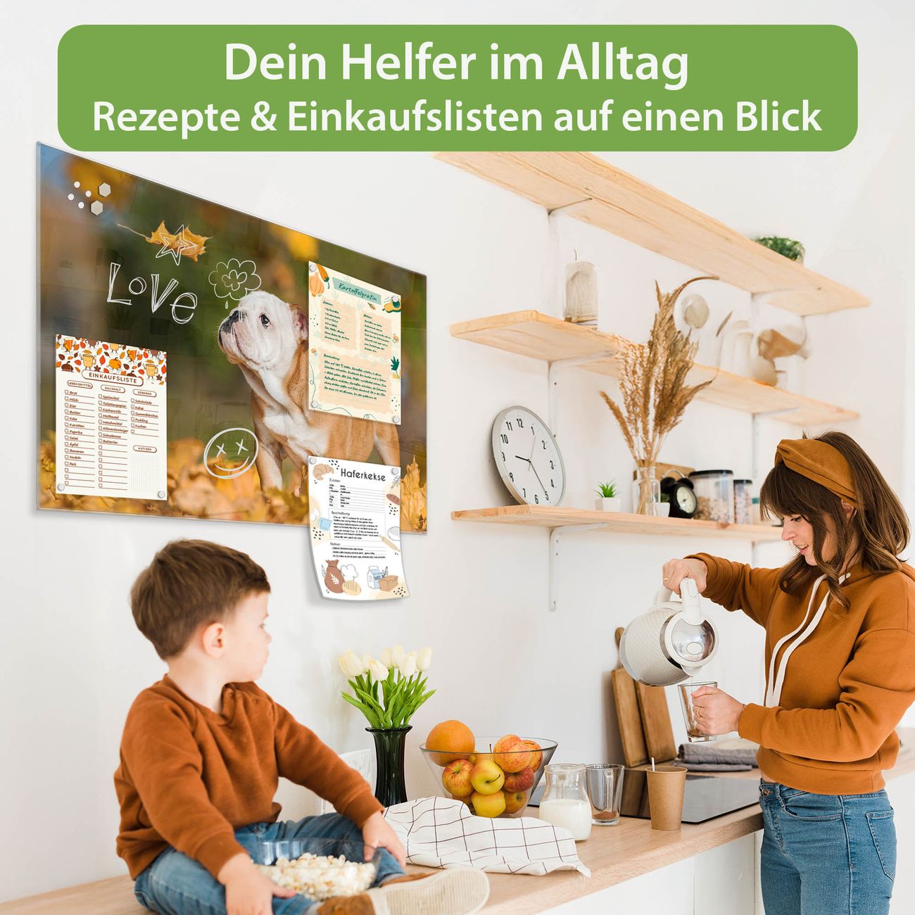 Auf der glatten Glasoberfläche lassen sich Termine, Rezepte oder Notizen ganz einfach mit Kreidestiften festhalten und rückstandslos entfernen. Starke Neodym-Magnete halten Ihre wichtigsten Erinnerungen sicher an Ort und Stelle. So entsteht Ihre ganz persönliche Ideenwand - jeden Tag neu.