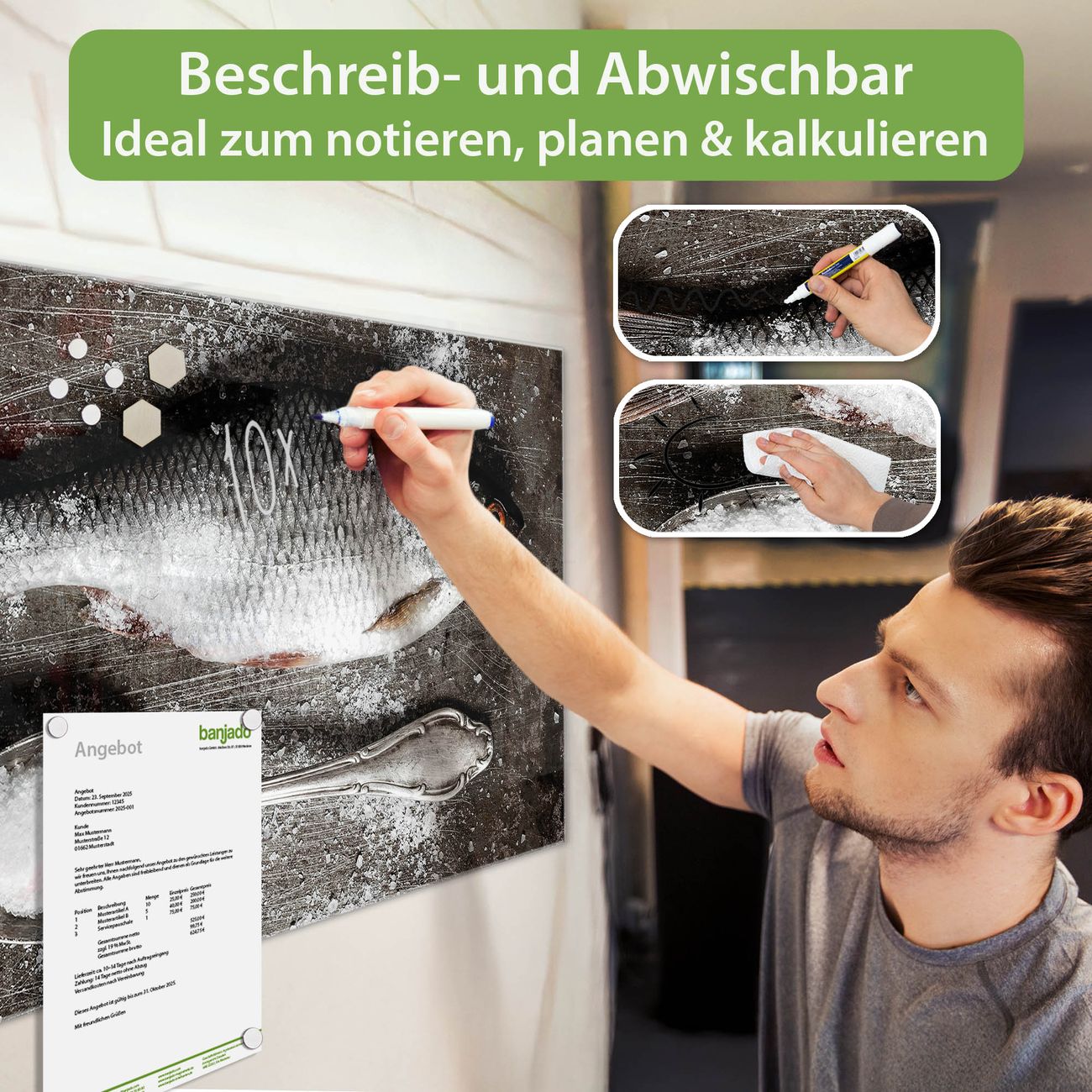 Die banjado Glas Magnettafel mit dem Motiv Motiv Fisch Und Salz verbindet Funktionalität mit Stil. Sie ersetzt das Zettelchaos durch klare Strukturen und bringt dabei eine warme, natürliche Atmosphäre in Ihr Zuhause. Ob im Büro, in der Küche oder im Eingangsbereich - dieses Design-Board zieht Blicke an und sorgt für Ordnung mit Charakter.