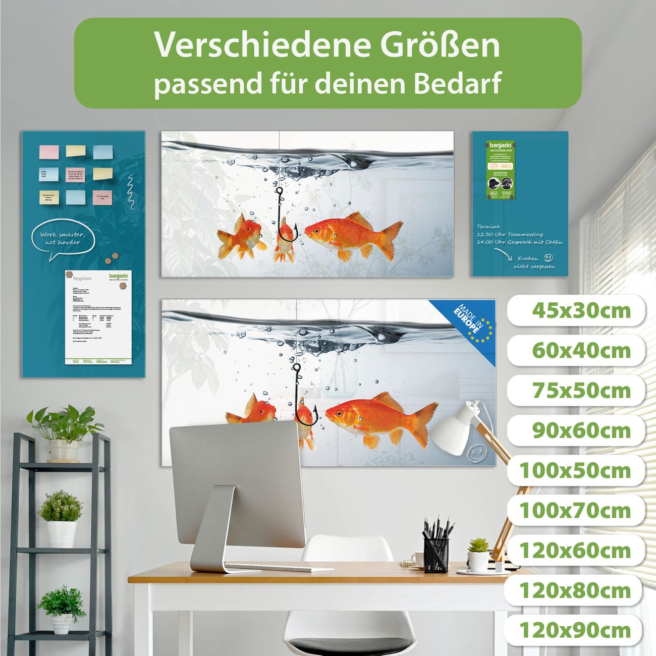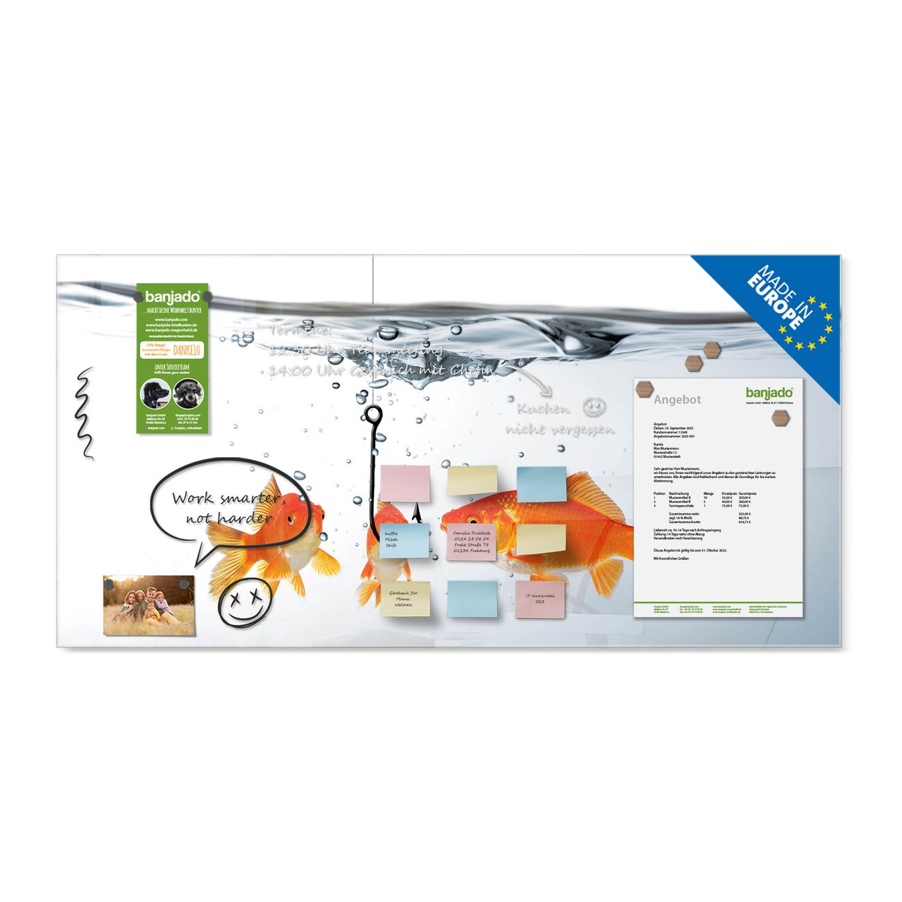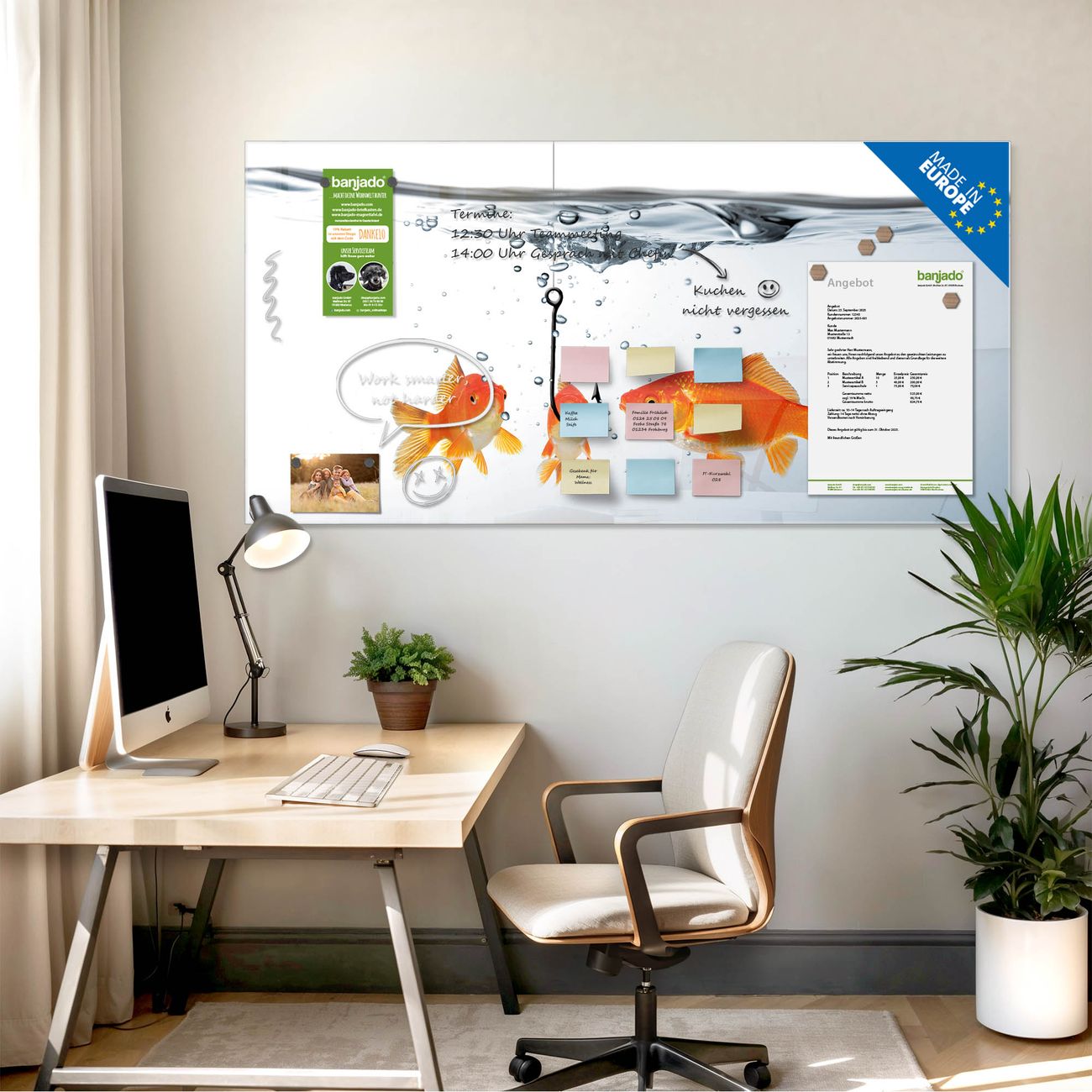 Jede Glas Magnettafel wird in unserer Werkstatt von Hand gefertigt und sorgfältig geprüft. So erhalten Sie ein echtes Qualitätsprodukt, das Funktion und Ästhetik perfekt vereint.?? Warum banjado?