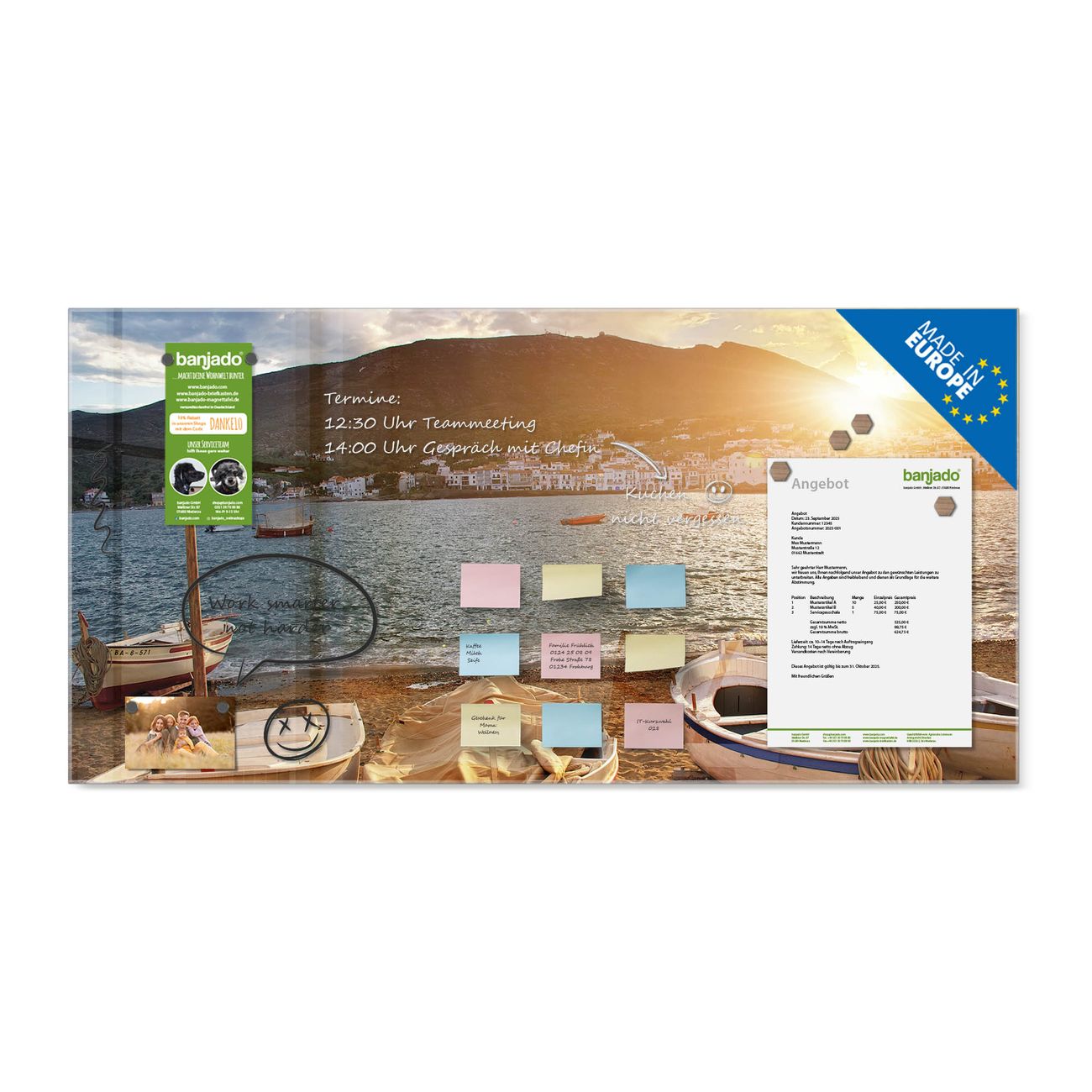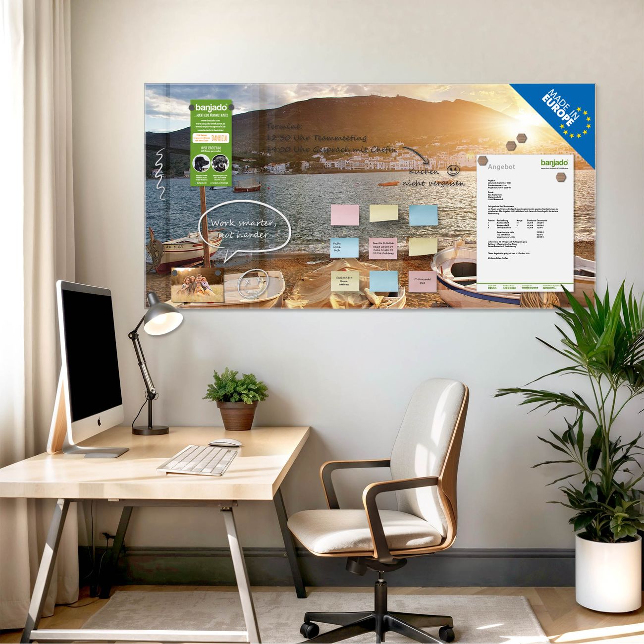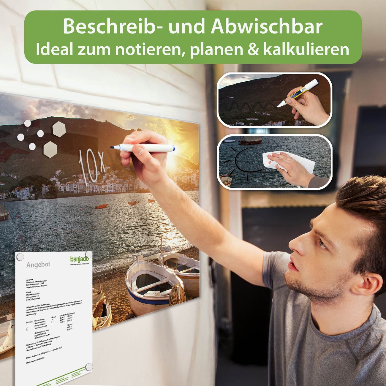 Jede Glas Magnettafel wird in unserer Werkstatt von Hand gefertigt und sorgfältig geprüft. So erhalten Sie ein echtes Qualitätsprodukt, das Funktion und Ästhetik perfekt vereint.?? Warum banjado?
