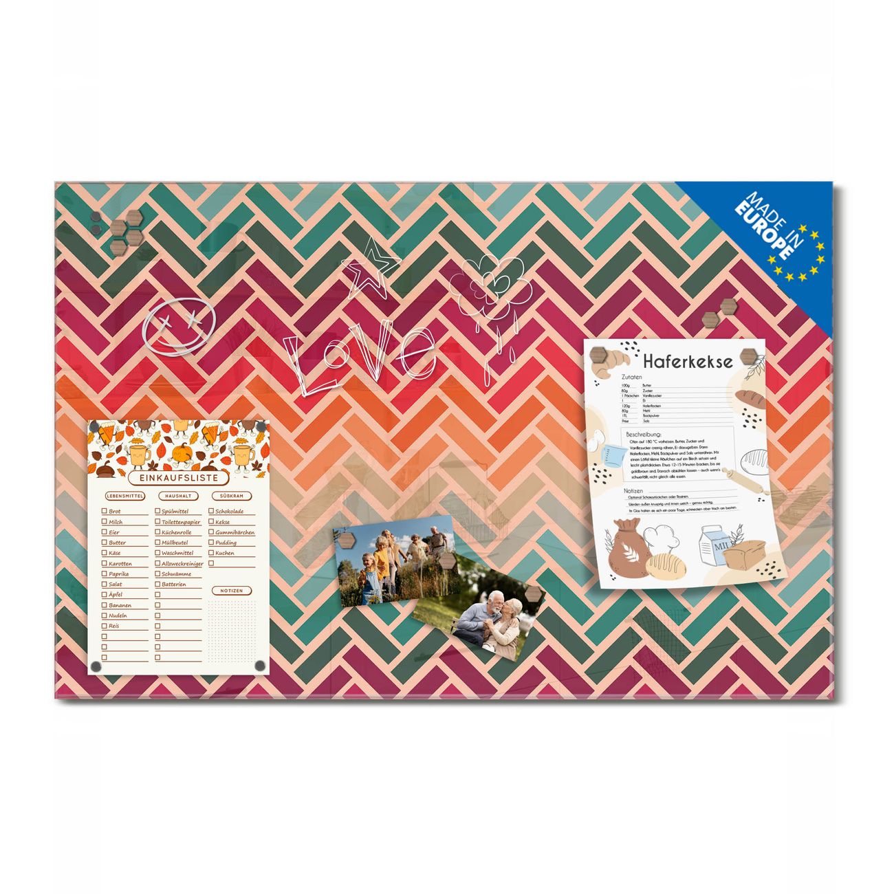 Die banjado Glas Magnettafel mit dem Motiv Motiv Fischgräten verbindet Funktionalität mit Stil. Sie ersetzt das Zettelchaos durch klare Strukturen und bringt dabei eine warme, natürliche Atmosphäre in Ihr Zuhause. Ob im Büro, in der Küche oder im Eingangsbereich - dieses Design-Board zieht Blicke an und sorgt für Ordnung mit Charakter.