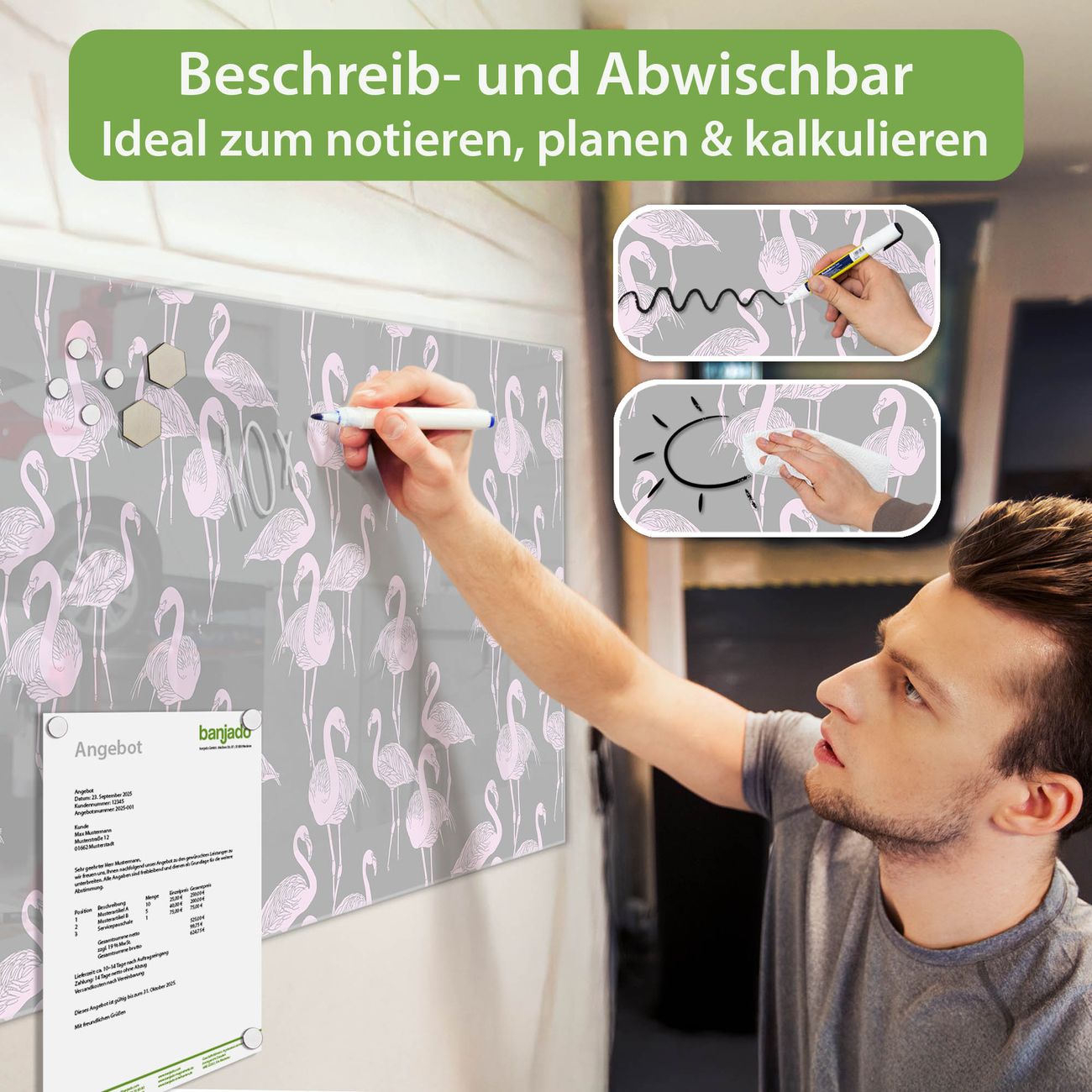 Jede Glas Magnettafel wird in unserer Werkstatt von Hand gefertigt und sorgfältig geprüft. So erhalten Sie ein echtes Qualitätsprodukt, das Funktion und Ästhetik perfekt vereint.?? Warum banjado?