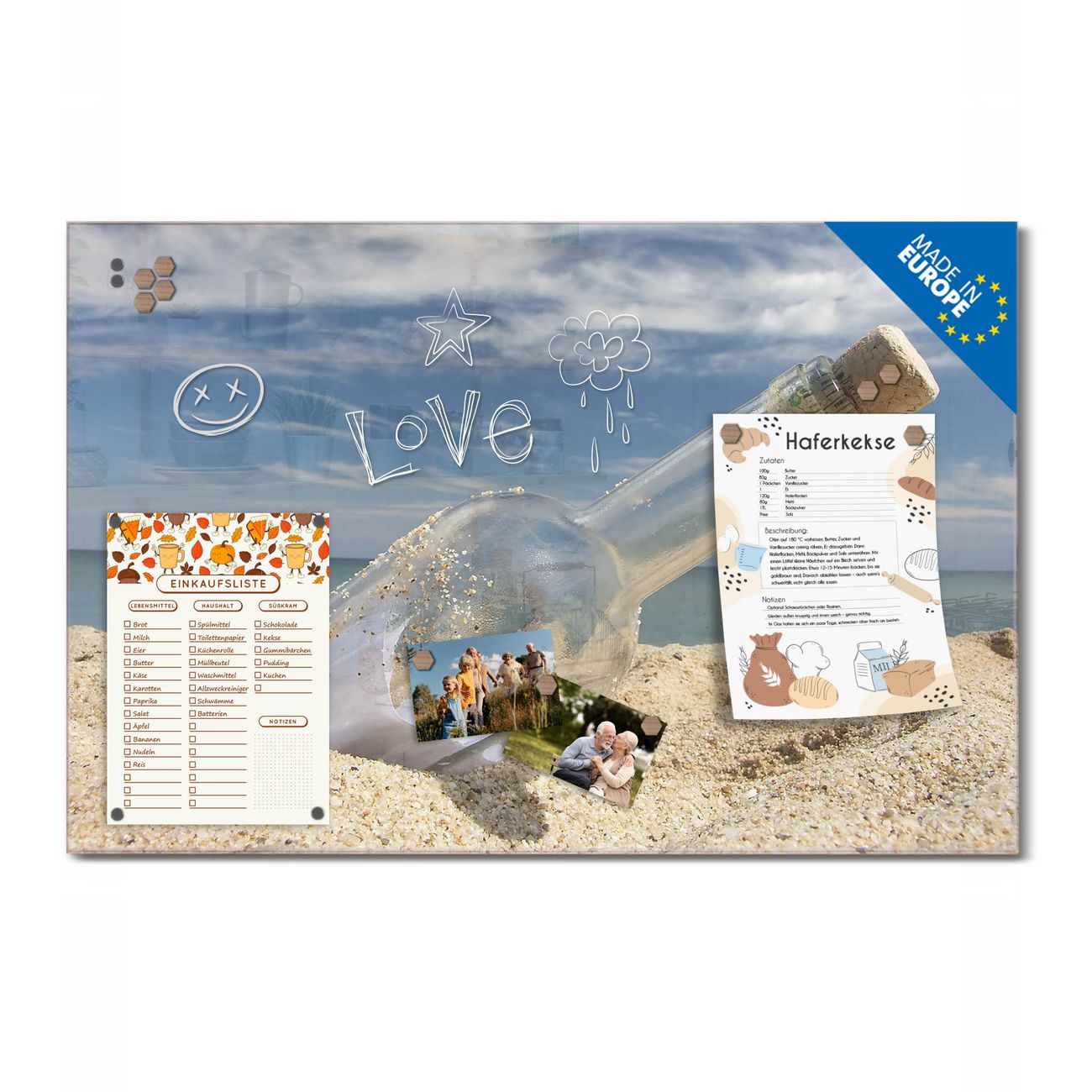 Ein Stück Design, das Ihren Alltag organisiert. Schreiben, heften, inspirieren - alles an einem Ort. Qualität, die man spürt. Montage leicht gemacht. Handwerk mit Herz - veredelt in Sachsen. Einzigartiges Design mit Motiv Motiv Flaschenpost Beschreibbare Glasoberfläche, leicht zu reinigen Starke Magnetkraft durch Stahlrückwand Inklusive 4 Neodym-Magneten Flexible Montageoptionen Handveredelt in Sachsen - Qualität, die bleibt