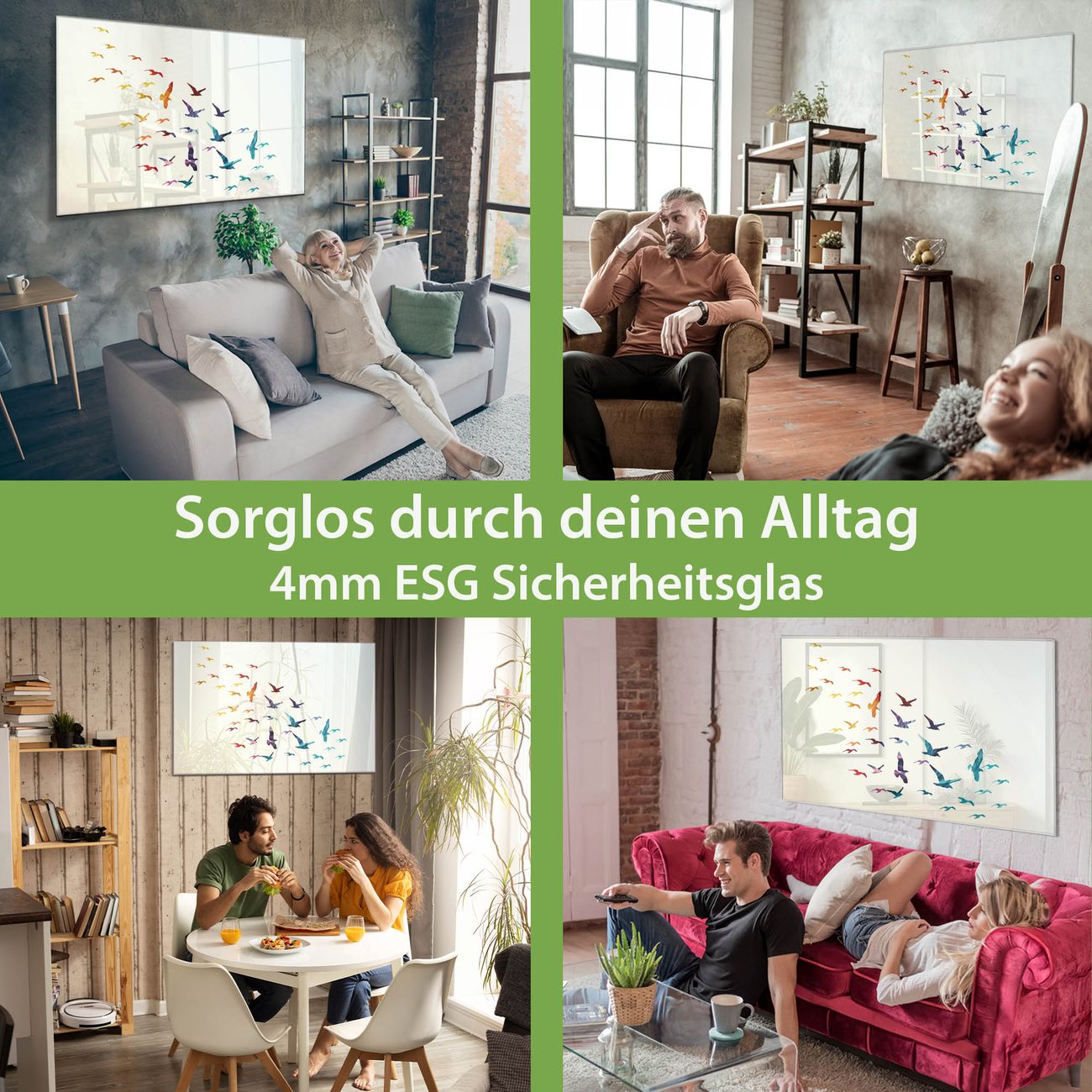 - Material: 4mm Sicherheitsglas mit Metallrückwand