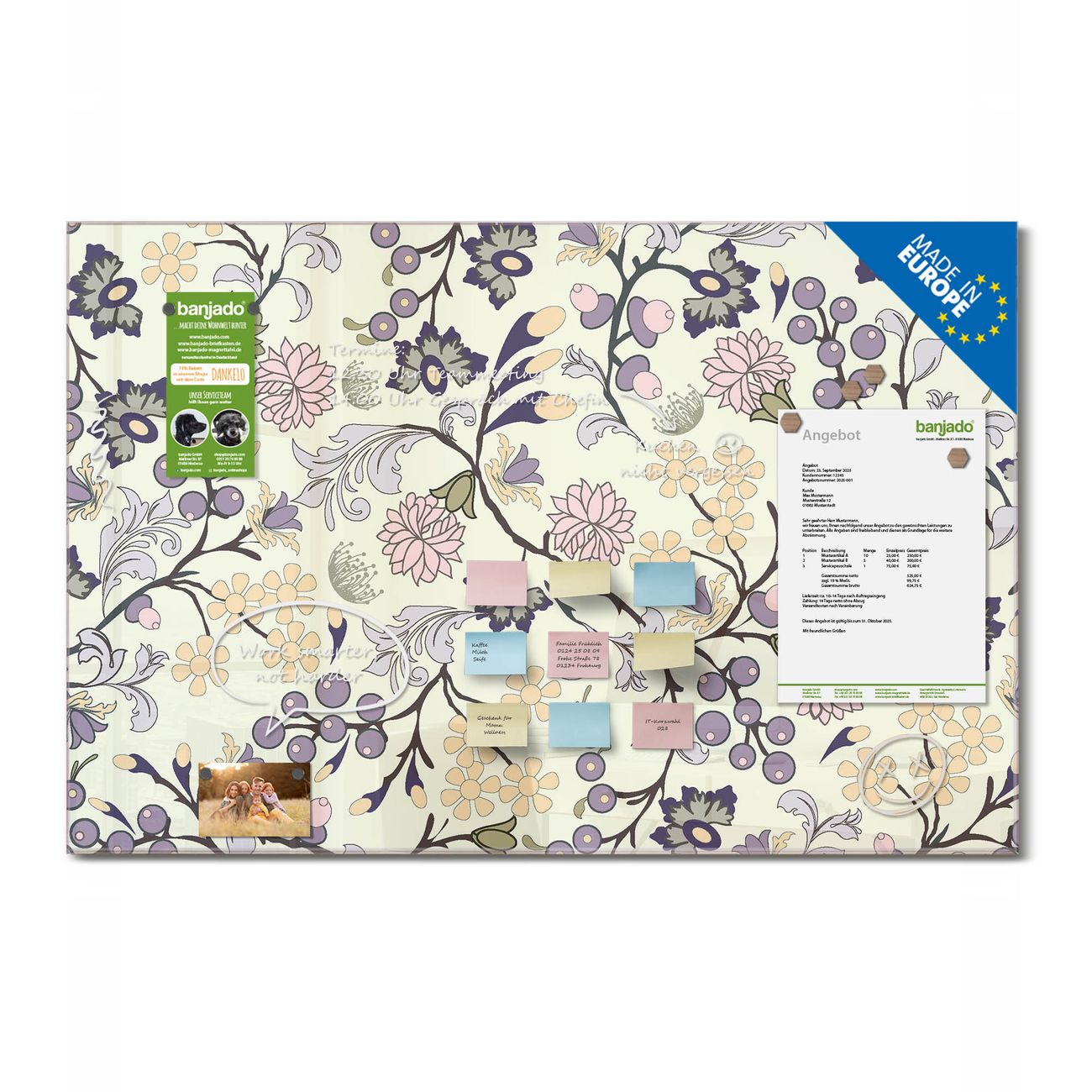 Jede Glas Magnettafel wird in unserer Werkstatt von Hand gefertigt und sorgfältig geprüft. So erhalten Sie ein echtes Qualitätsprodukt, das Funktion und Ästhetik perfekt vereint.?? Warum banjado?