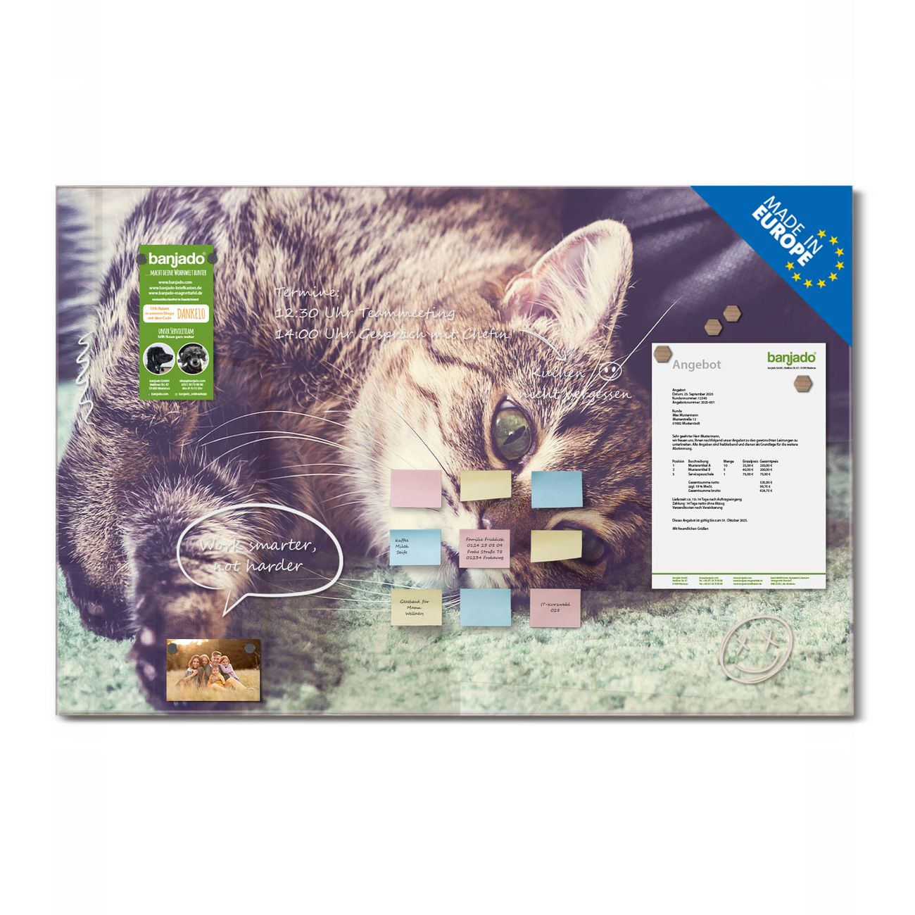 Jede Glas Magnettafel wird in unserer Werkstatt von Hand gefertigt und sorgfältig geprüft. So erhalten Sie ein echtes Qualitätsprodukt, das Funktion und Ästhetik perfekt vereint.?? Warum banjado?