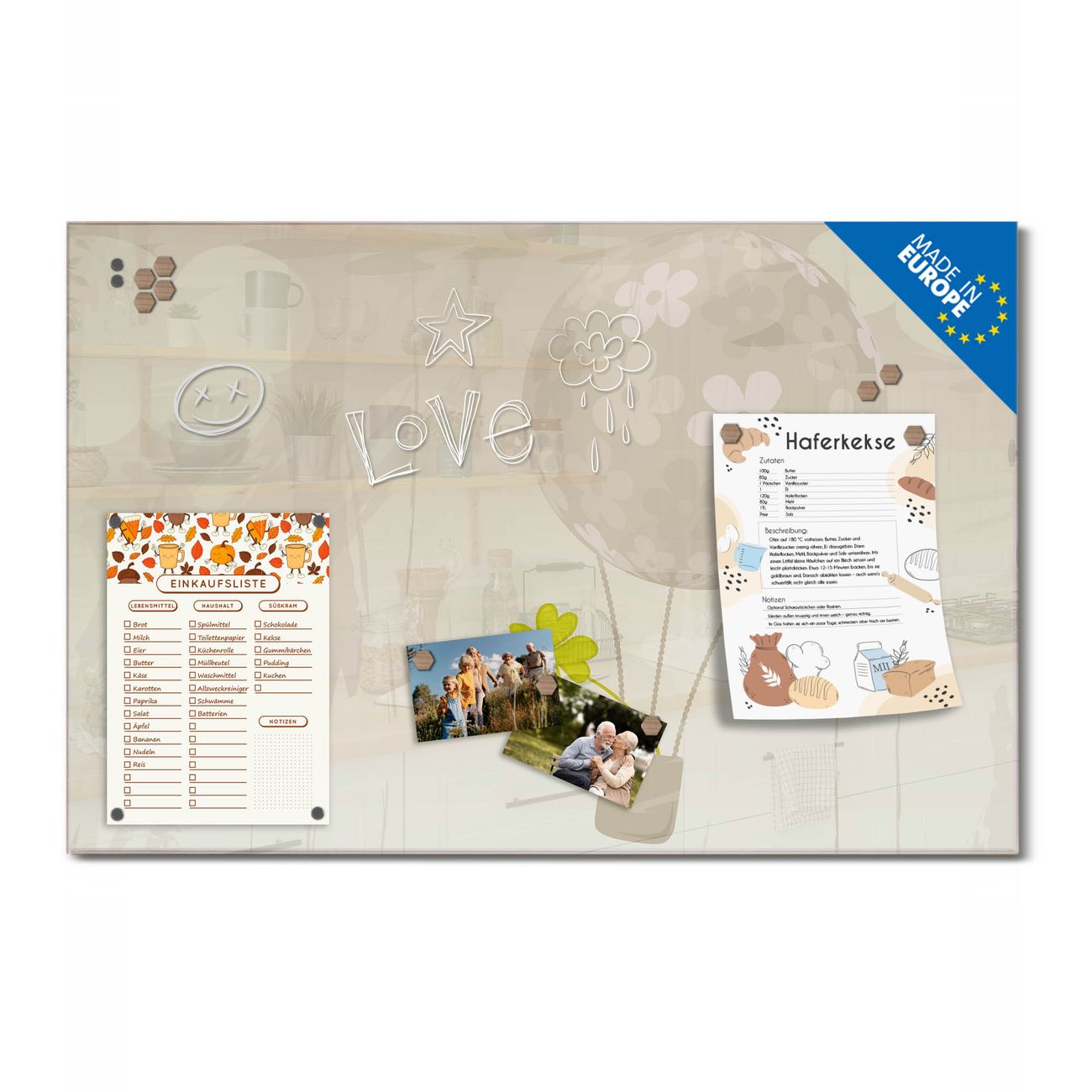 Auf der glatten Glasoberfläche lassen sich Termine, Rezepte oder Notizen ganz einfach mit Kreidestiften festhalten und rückstandslos entfernen. Starke Neodym-Magnete halten Ihre wichtigsten Erinnerungen sicher an Ort und Stelle. So entsteht Ihre ganz persönliche Ideenwand - jeden Tag neu.