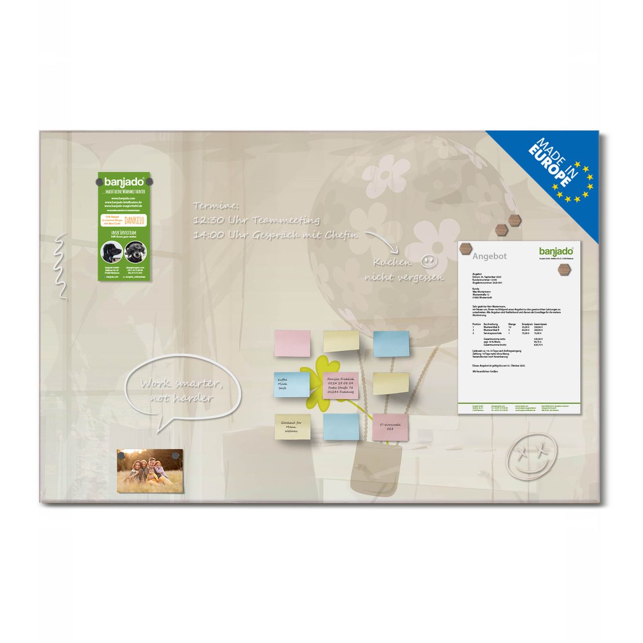 Jede Glas Magnettafel wird in unserer Werkstatt von Hand gefertigt und sorgfältig geprüft. So erhalten Sie ein echtes Qualitätsprodukt, das Funktion und Ästhetik perfekt vereint.?? Warum banjado?