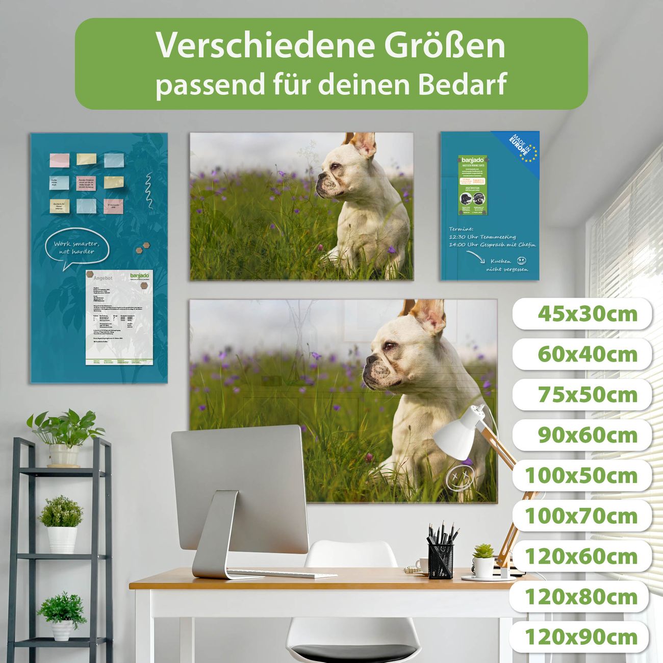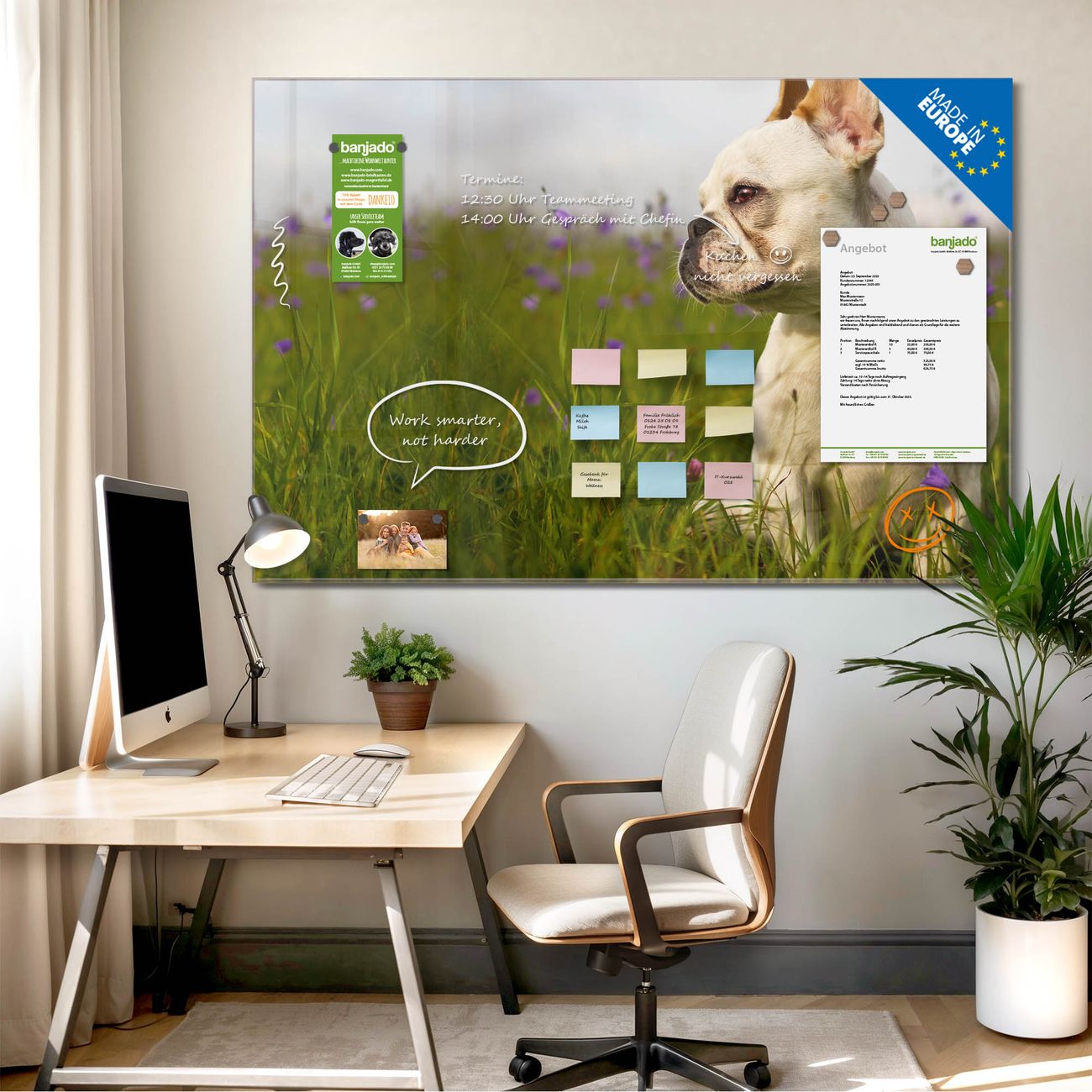 Die banjado Glas Magnettafel mit dem Motiv Motiv Französische Bulldogge verbindet Funktionalität mit Stil. Sie ersetzt das Zettelchaos durch klare Strukturen und bringt dabei eine warme, natürliche Atmosphäre in Ihr Zuhause. Ob im Büro, in der Küche oder im Eingangsbereich - dieses Design-Board zieht Blicke an und sorgt für Ordnung mit Charakter.