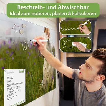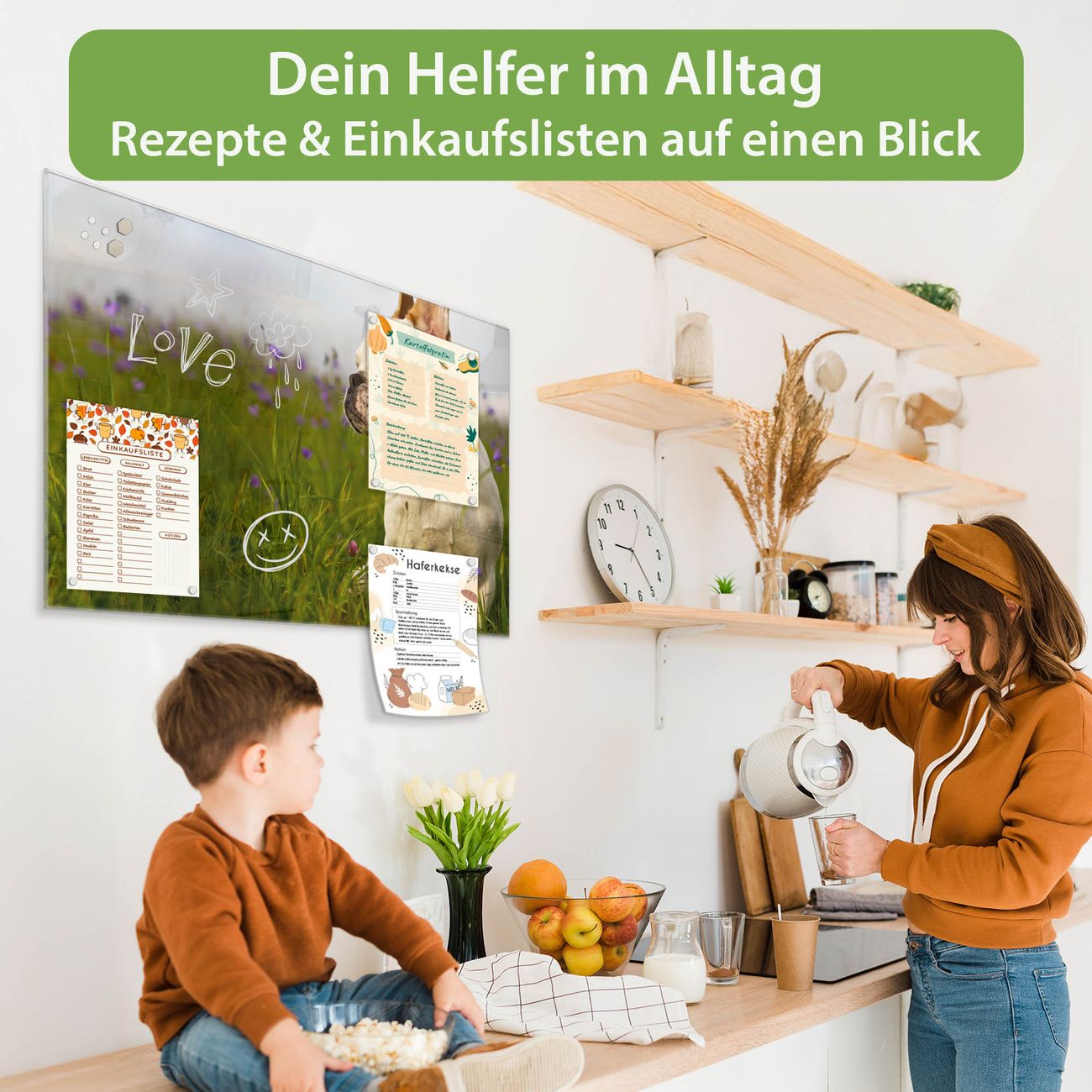 Auf der glatten Glasoberfläche lassen sich Termine, Rezepte oder Notizen ganz einfach mit Kreidestiften festhalten und rückstandslos entfernen. Starke Neodym-Magnete halten Ihre wichtigsten Erinnerungen sicher an Ort und Stelle. So entsteht Ihre ganz persönliche Ideenwand - jeden Tag neu.