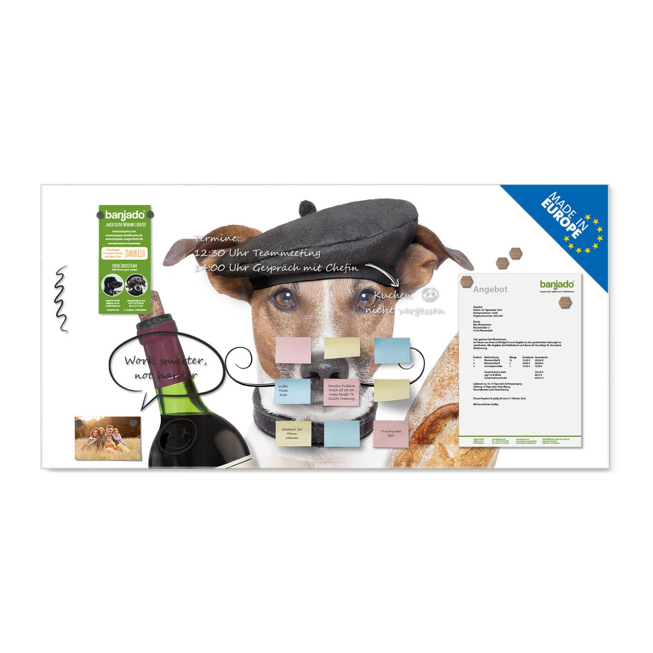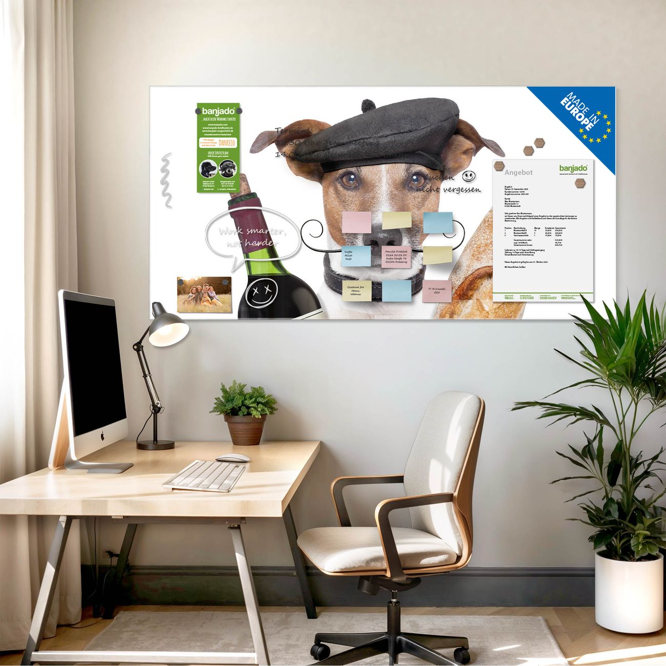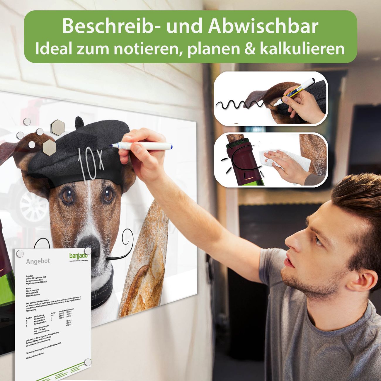 Jede Glas Magnettafel wird in unserer Werkstatt von Hand gefertigt und sorgfältig geprüft. So erhalten Sie ein echtes Qualitätsprodukt, das Funktion und Ästhetik perfekt vereint.?? Warum banjado?